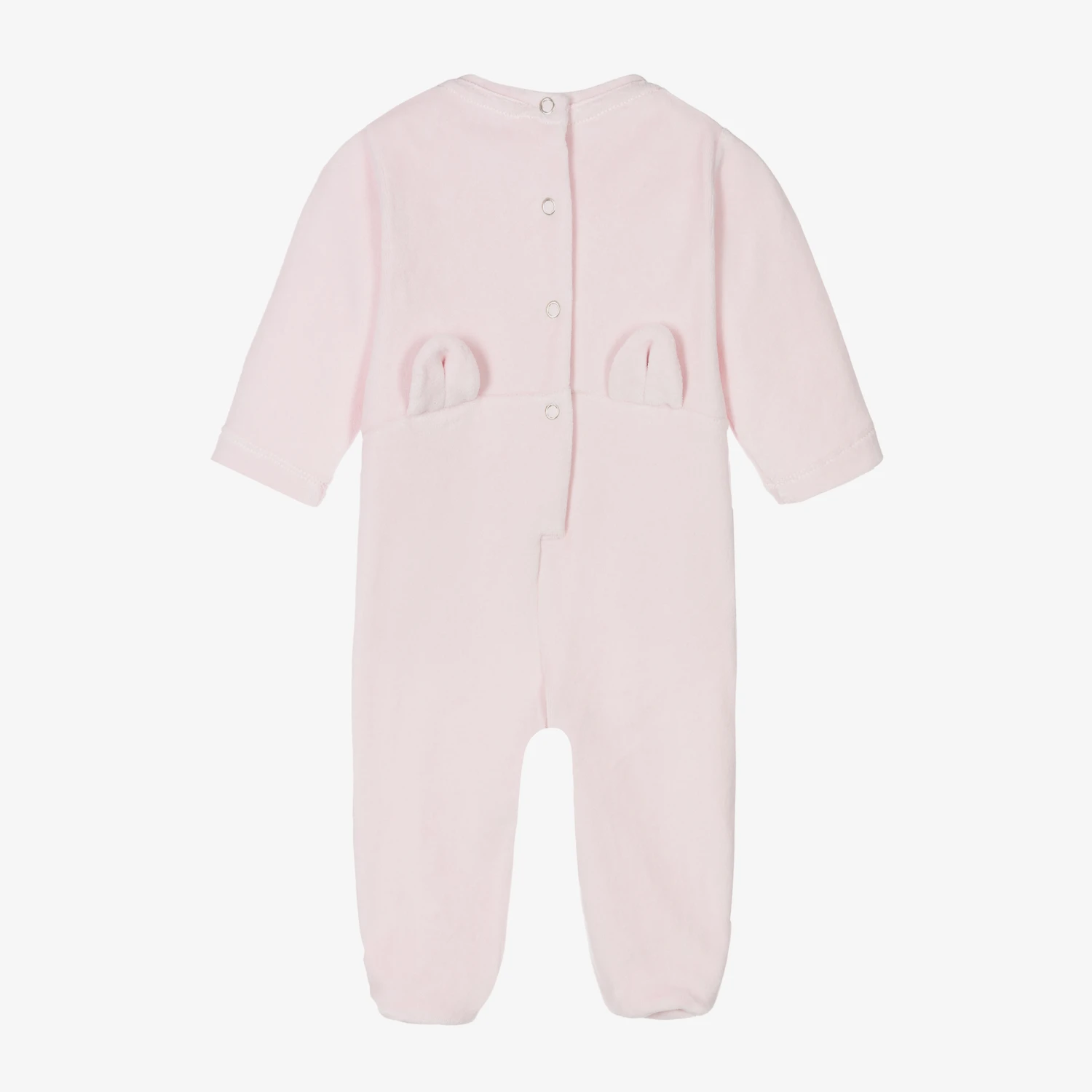 Adorable pale pink velour babygrow for baby girls by Lapin House. With gorgeous pink grosgrain bows on the feet, it has a brown teddy bear print on the front, with slanted logo print pockets. Around the back there are cute ear appliqués and popper fastenings, with more between the legs for easy dressing.
