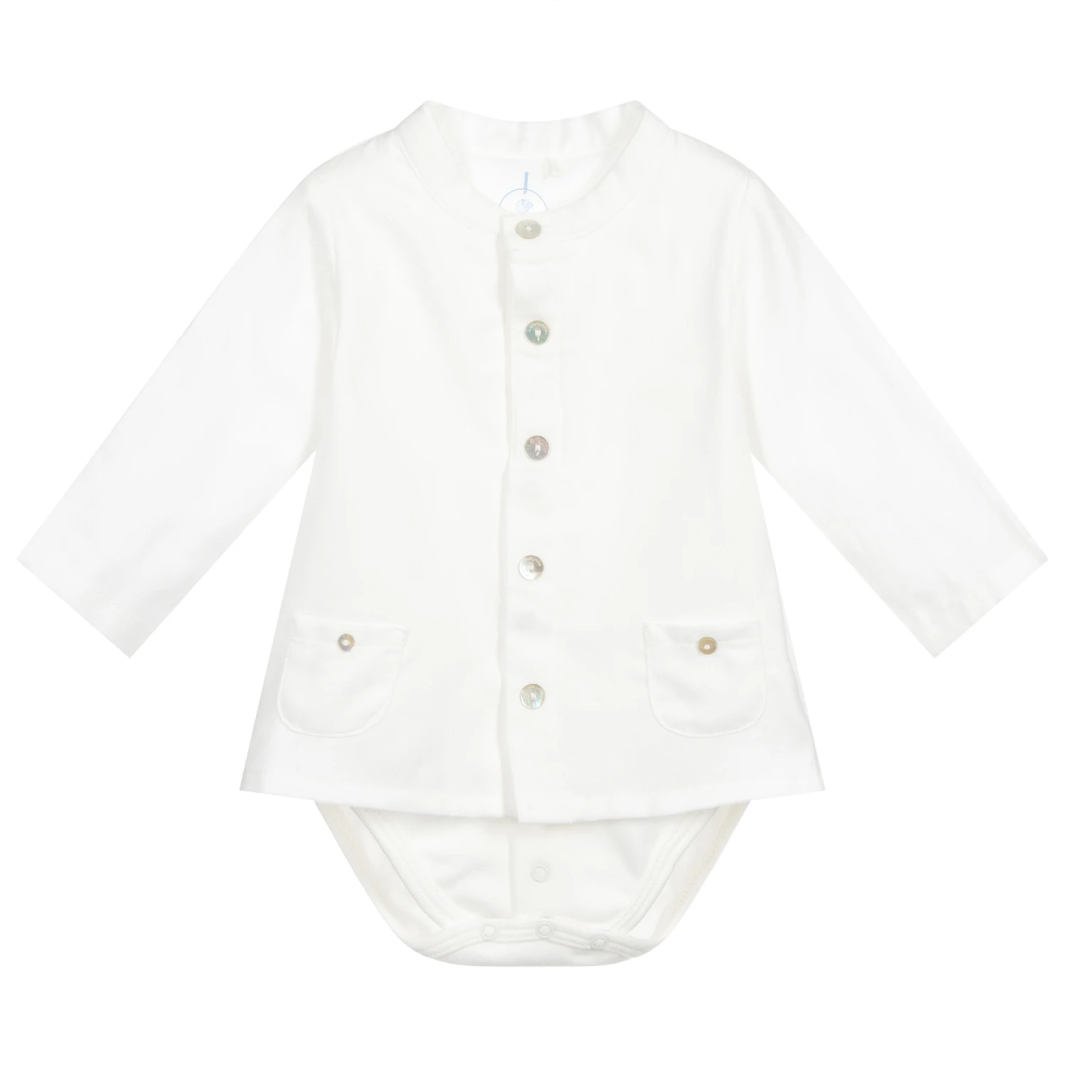 Ivory shirt for baby boys by Laranjinha, with an attached bodyvest. The shirt has decorative mother-of-pearl buttons on the front, with popper fastenings beneath. There are also poppers between the legs, which ensure the shirt stays neatly tucked in.