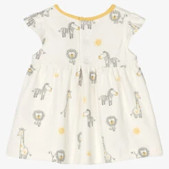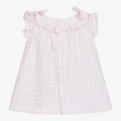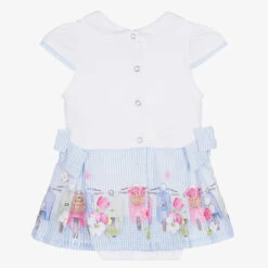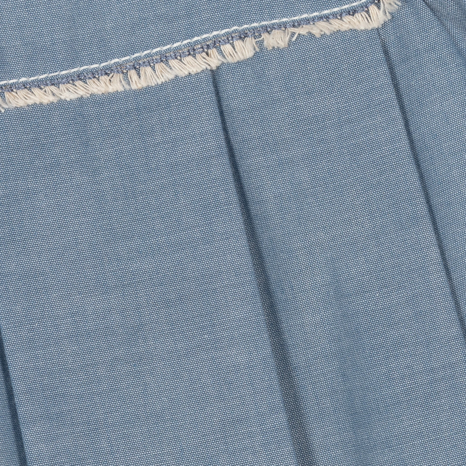 Sweet blue dress for baby girls by Laranjinha, made in lightweight cotton chambray. Fully lined, it has soft jersey sleeves, ivory fringing on the bodice, and a pleated skirt.