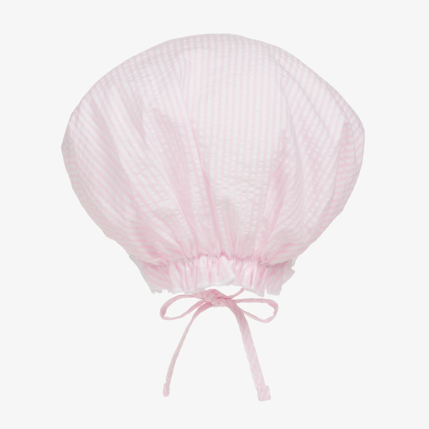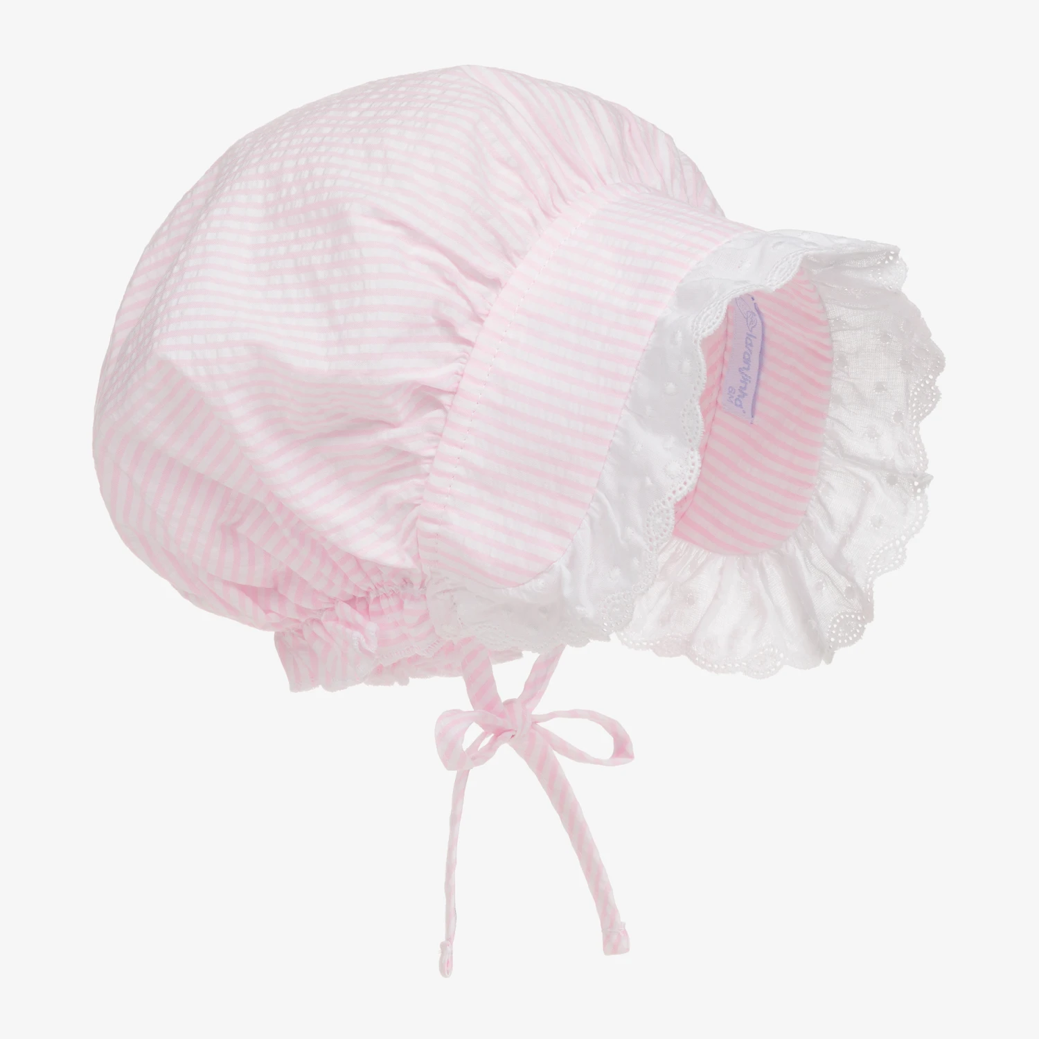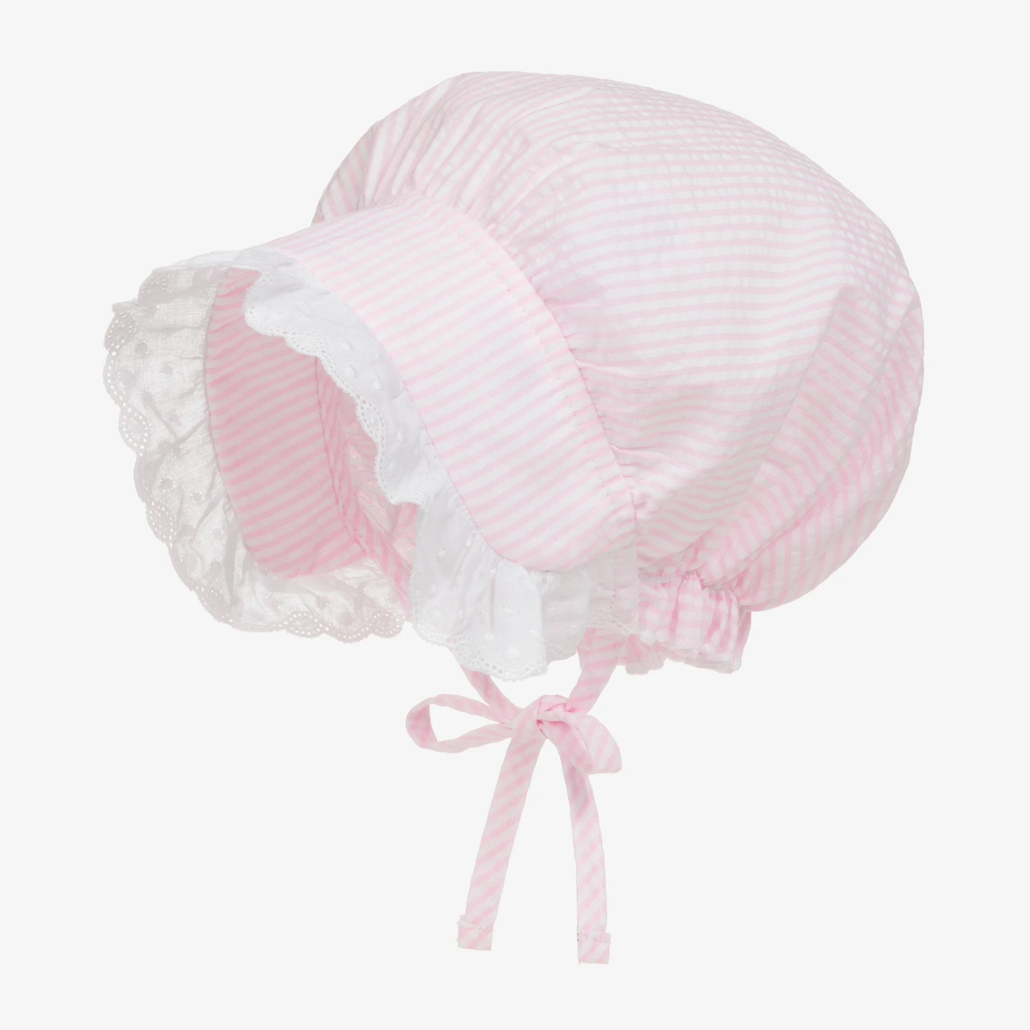 A traditional pink and white striped bonnet for baby girls by Laranjinha. It is made in soft cotton seersucker and has a pretty lace trim. There is an elasticated back, with ties to secure under the chin.