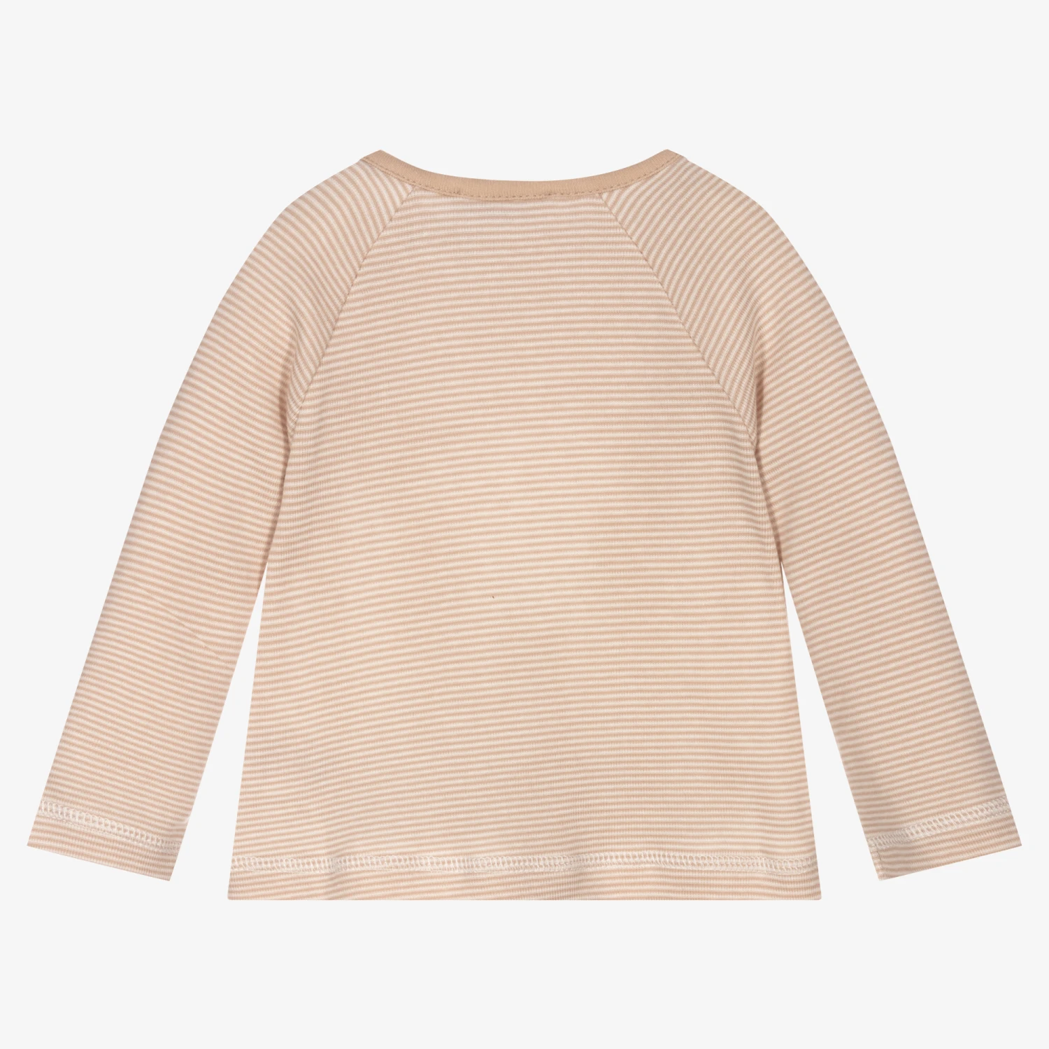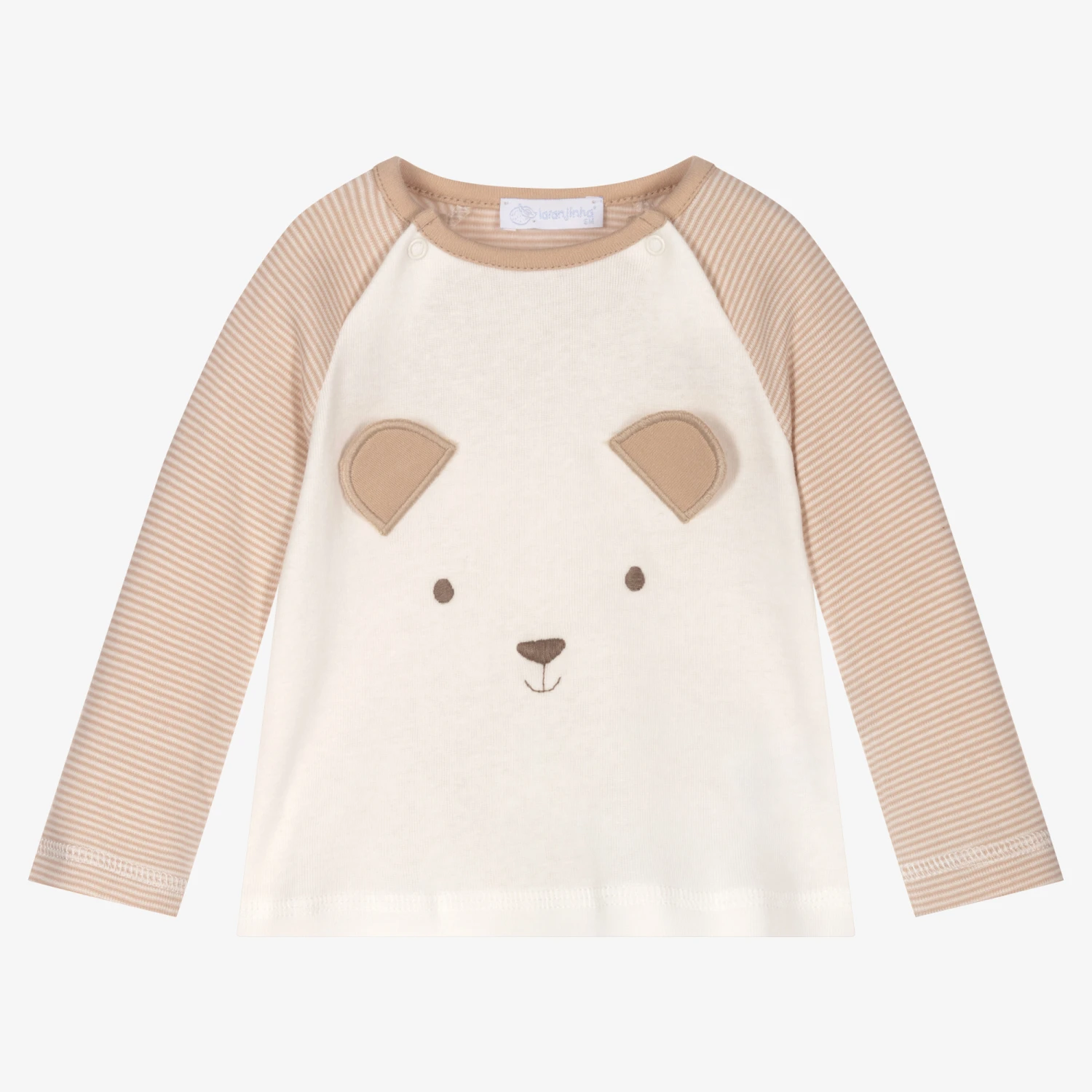 Long-sleeved, beige striped top for baby boys by Laranjinha, made in soft cotton jersey. It has an ivory panel on the front with an embroidered teddy bear face and cute appliqué ear flaps.