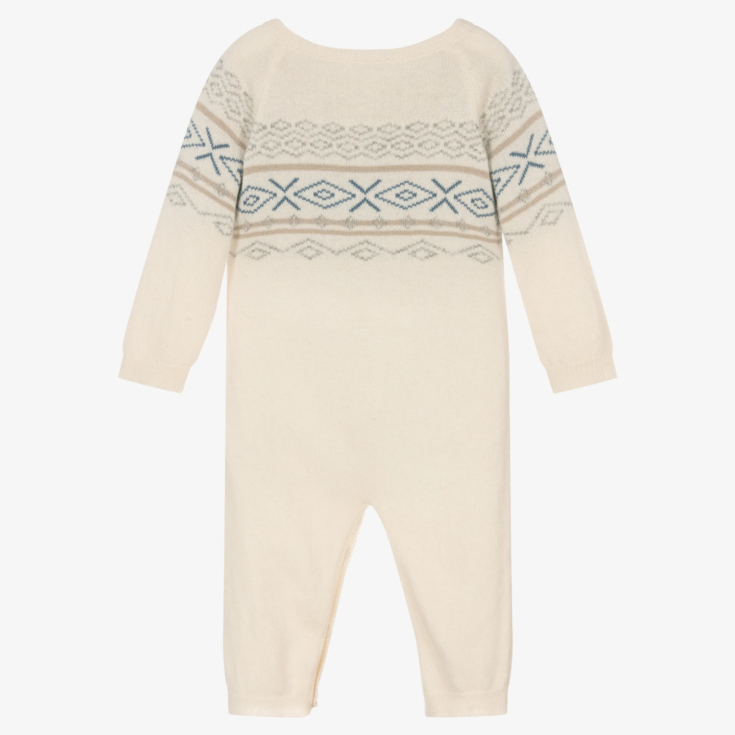 Sweet ivory romper for baby boys and girls by Laranjinha. Comfortable and cosy, it is knitted from a soft blend of viscose, extra fine Merino wool and cashmere, with a charming blue, grey and beige Fair Isle pattern around the top. It fastens with pretty mother-of-pearl buttons on the front and down one leg.