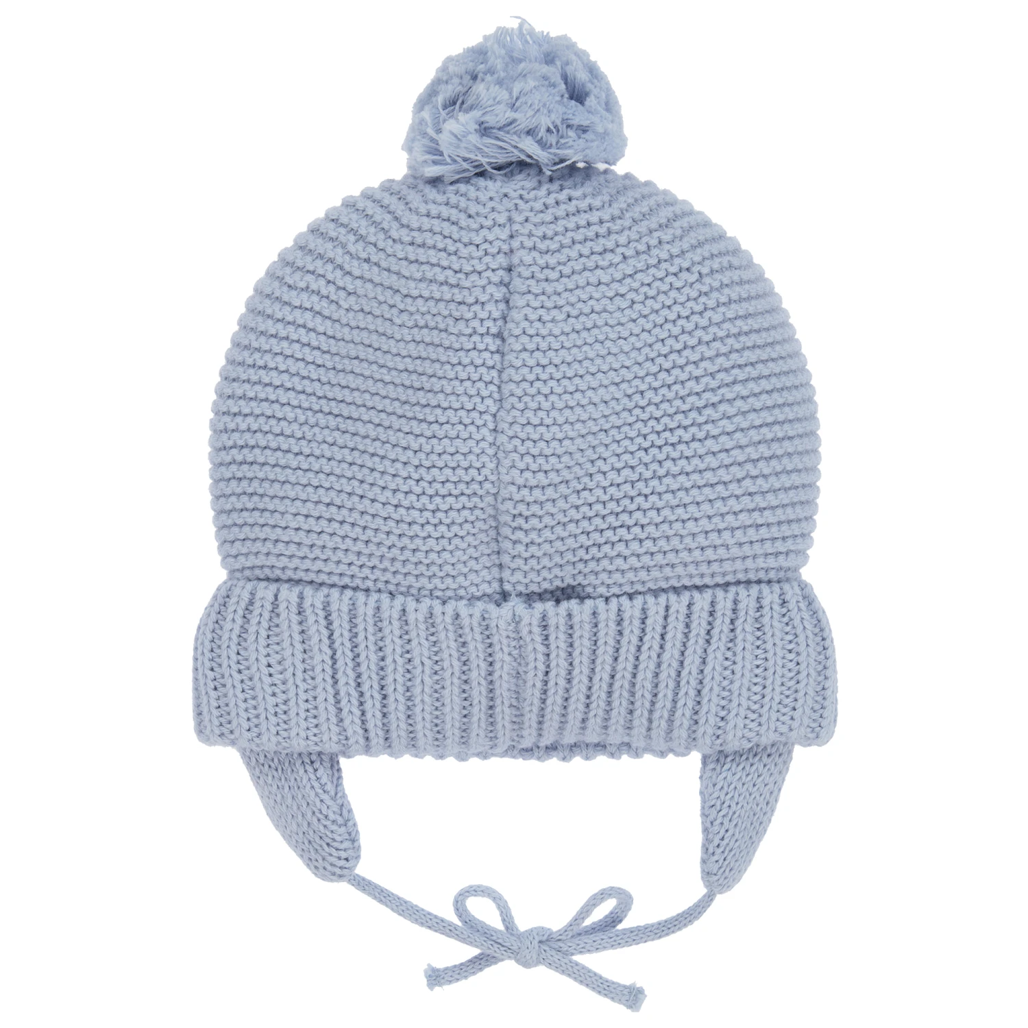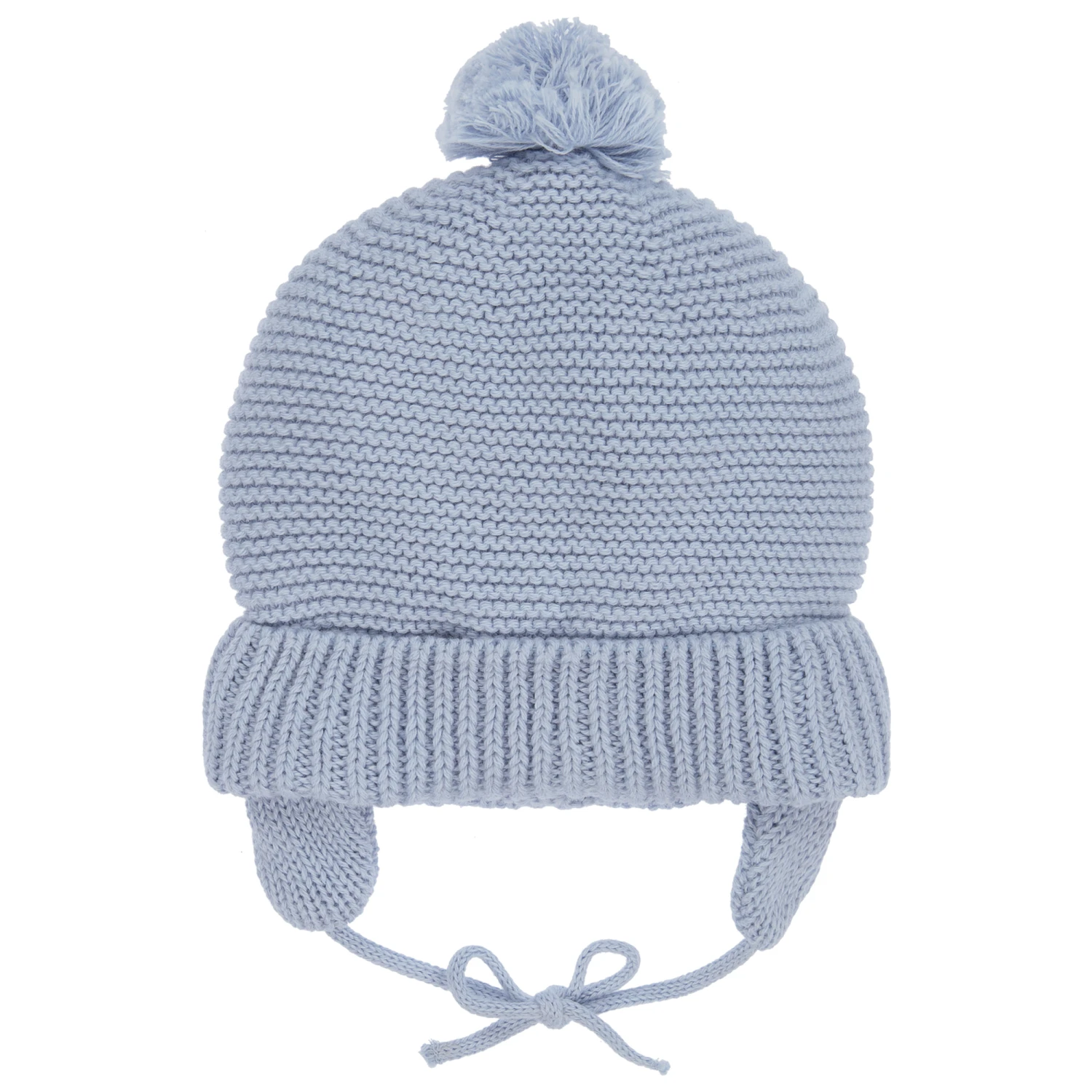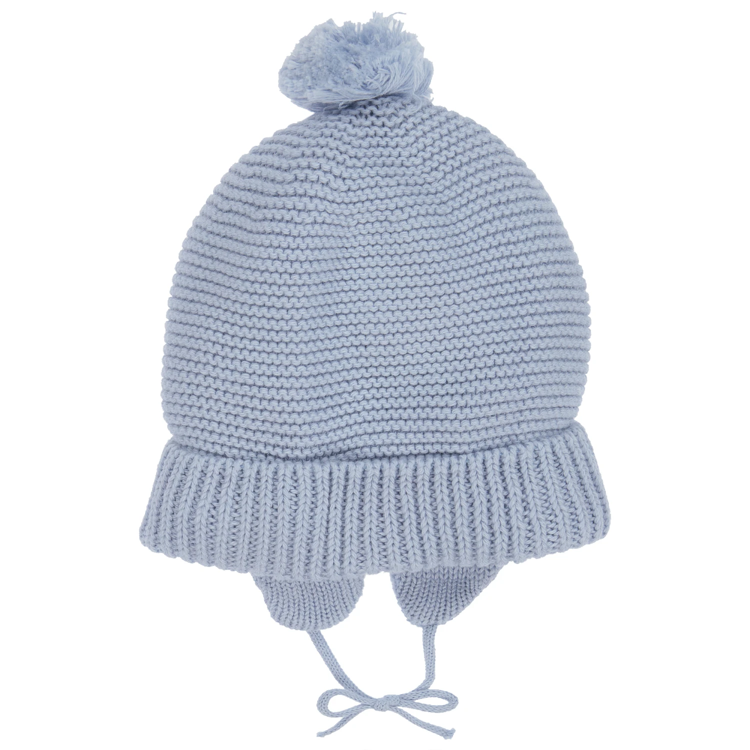Blue hat for baby girls and boys by Laranjinha, knitted in a soft cotton and cashmere blend. It has a little pom-pom on top, knitted ear flaps, and ties for securing under the chin.