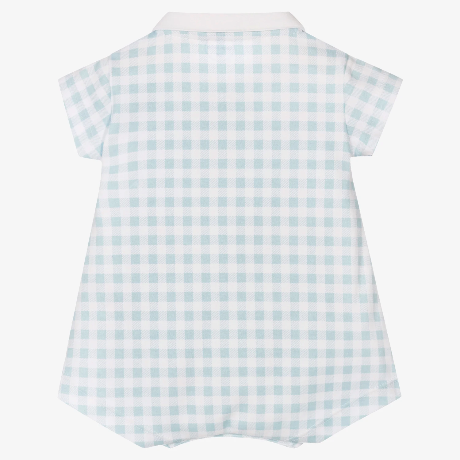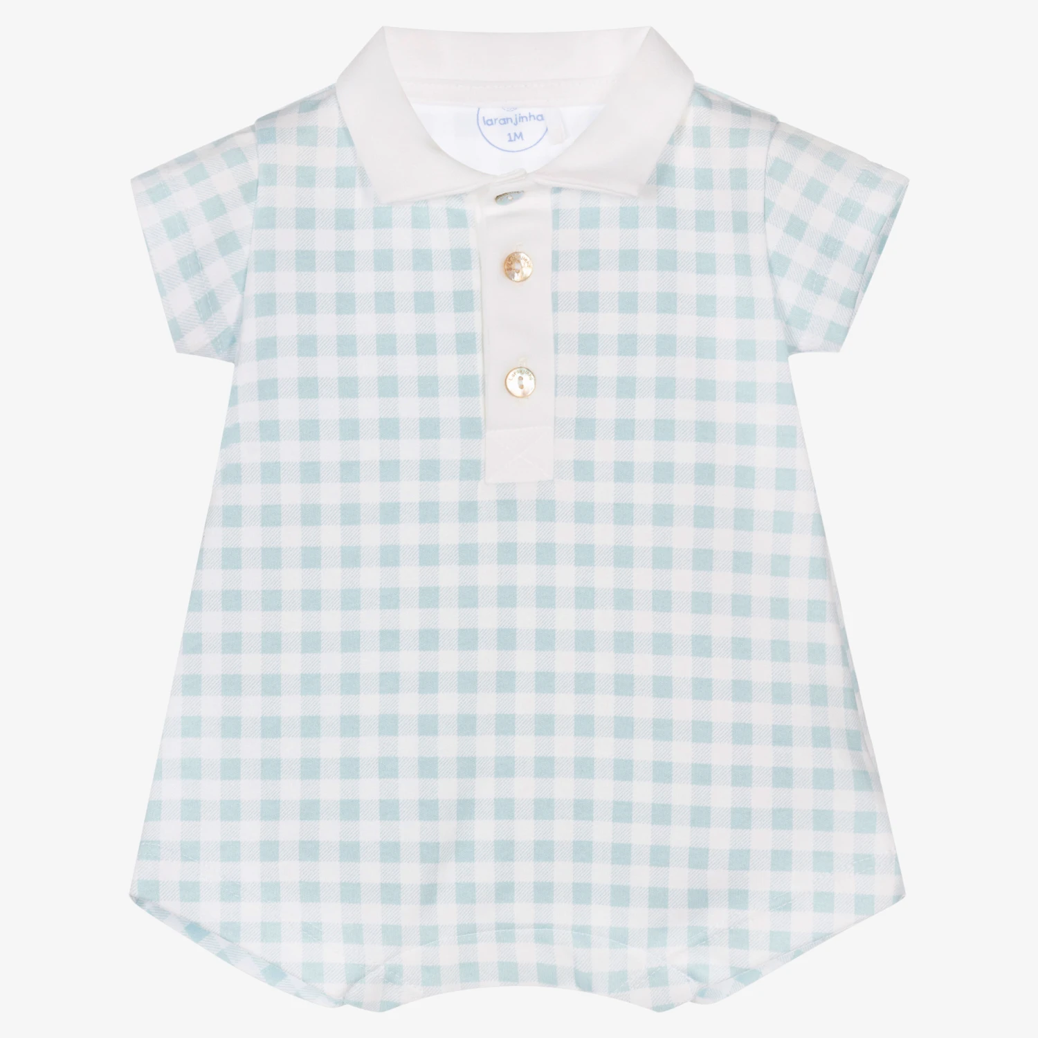Off-white and mint blue checked shortie for baby boys and girls, by Laranjinha. It is made from soft and stretchy cotton jersey with a little white pointed collar and a polo placket, fastening with branded mother-of-pearl buttons. There are popper fastenings between the legs to make changing easier.