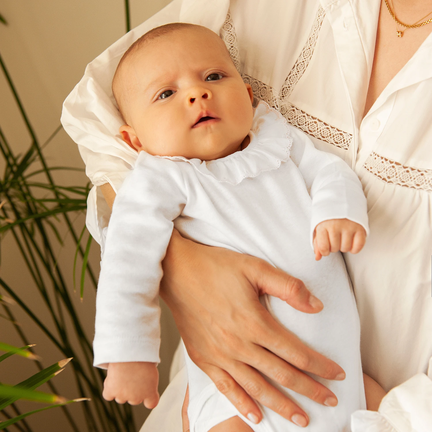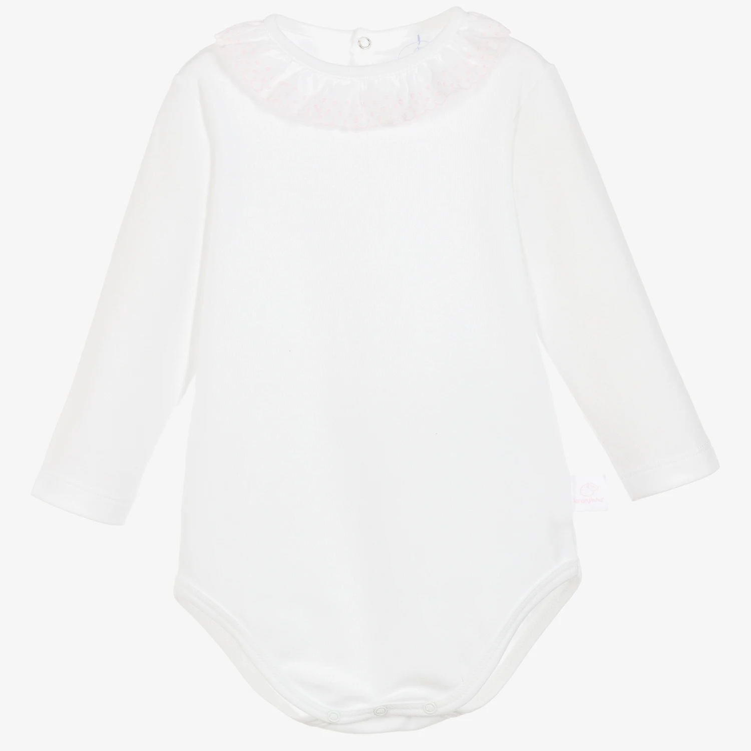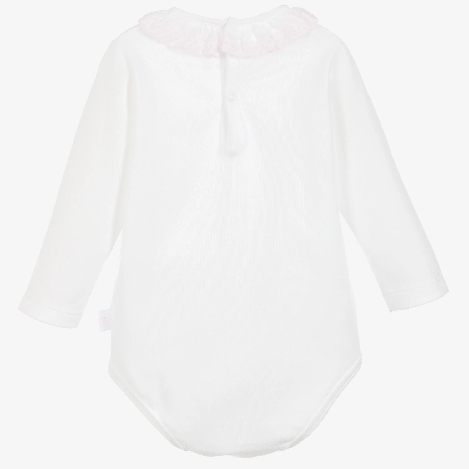 A white bodysuit for baby girls by Laranjinha, with a sweet pink embroidered broderie anglaise ruffle collar. Made from soft cotton jersey, it has popper fastening down the back and between the legs.