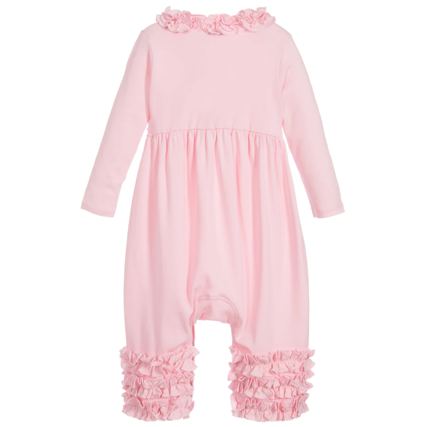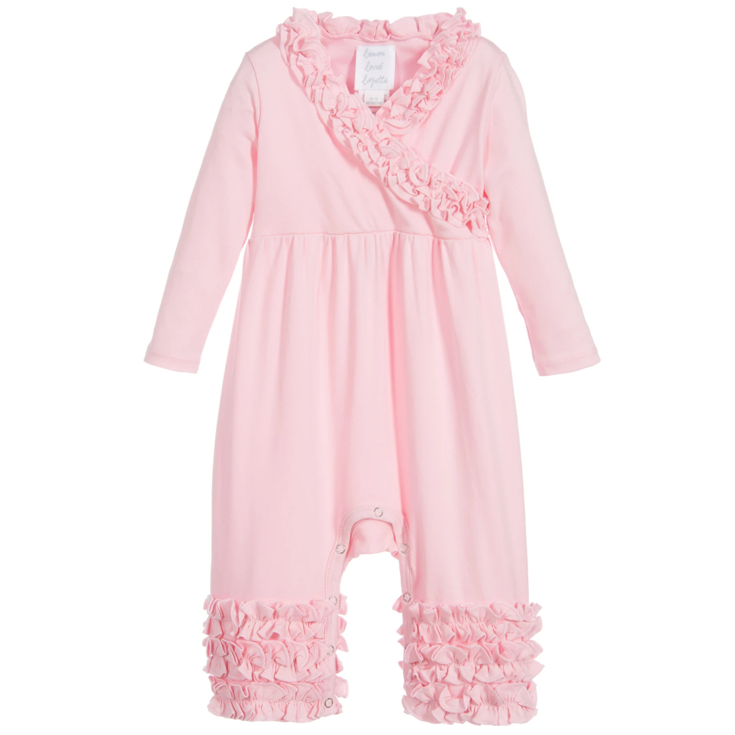 Lemon Loves Layette pale pink Pima cotton jersey ‘Olivia’ one piece babygrow for little girls. It has a fitted top and a comfortable, loose fitting shape below the waist. With elegant ruffles around the neck and cuffs, it has poppers that fasten between the legs.