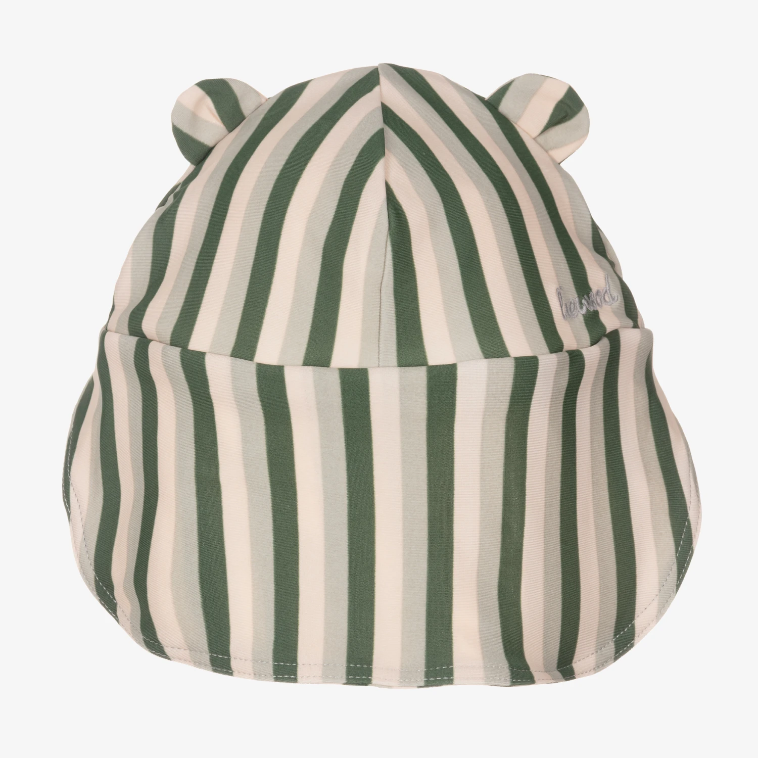 Green and ivory striped sun protective hat for baby boys by Liewood, with UPF50+. Suitable to wear in the water, it is made in soft and stretchy fabric using recycled material. There is a front peak and back neck covering, providing full head protection from the sun. It has cute little ears on top and subtle logo embroidery on the back.