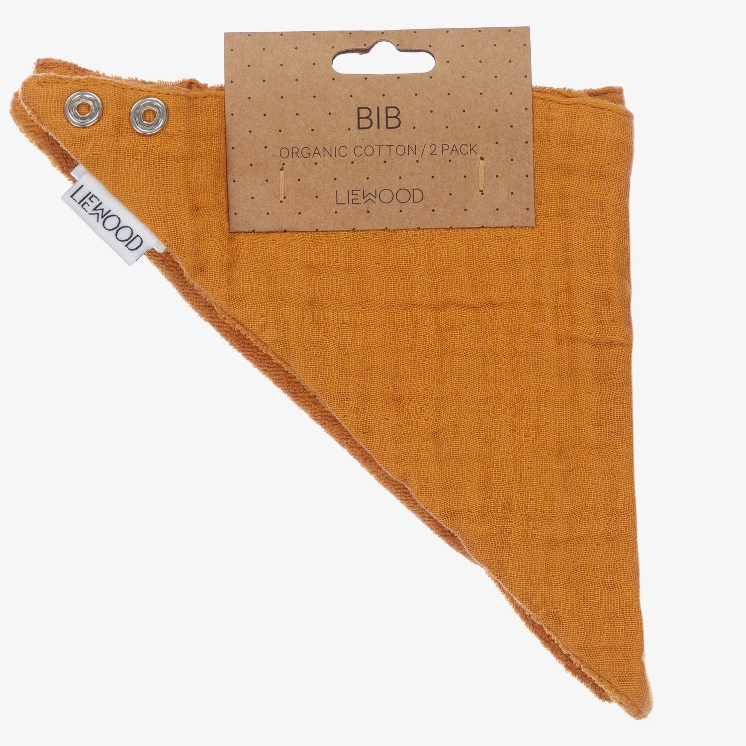 A two pack of super soft mustard yellow organic cotton bibs for baby boys and girls by Liewood, with a soft towelling lining for comfort. This softly padded neckerchief style bib fastens easily on the back of the neck.