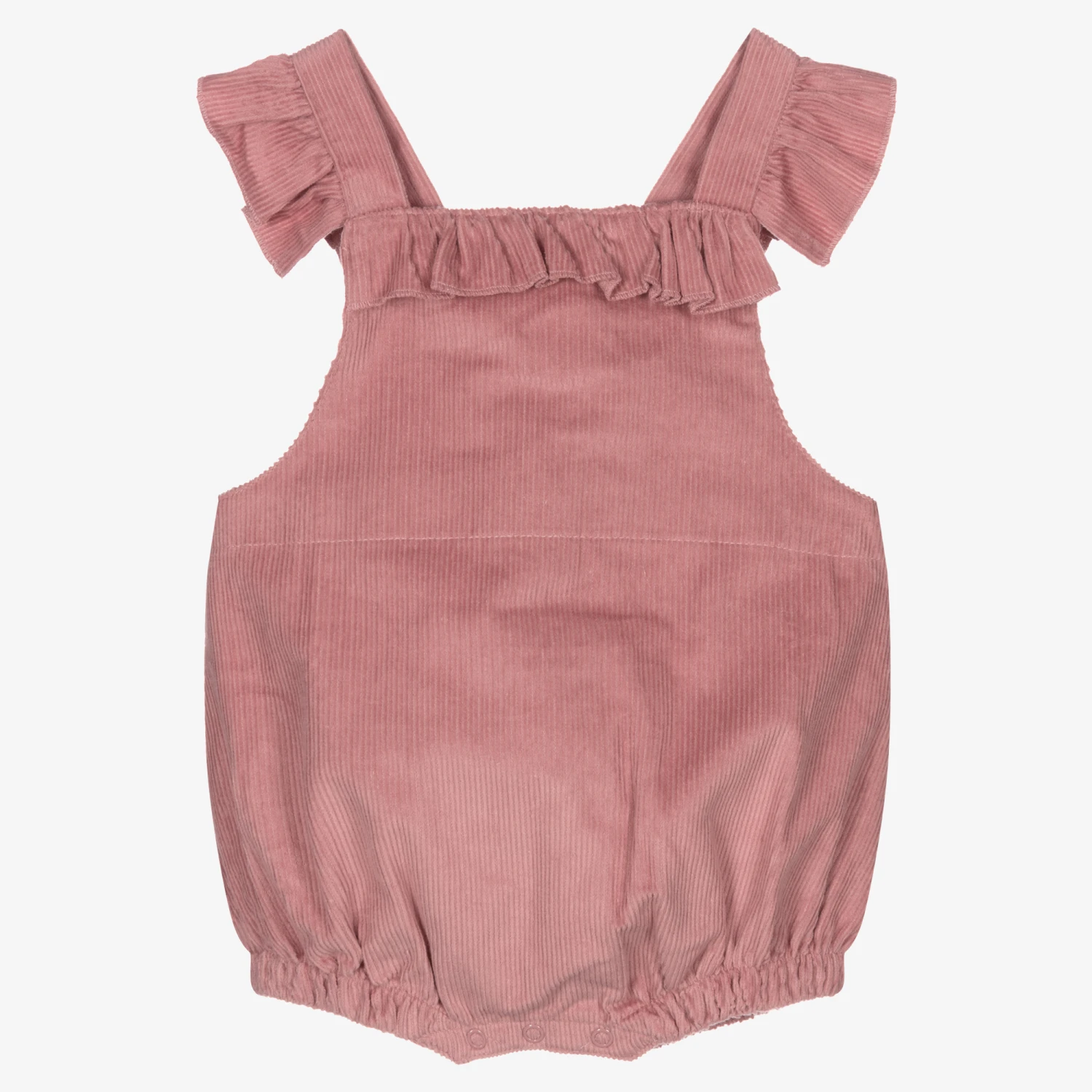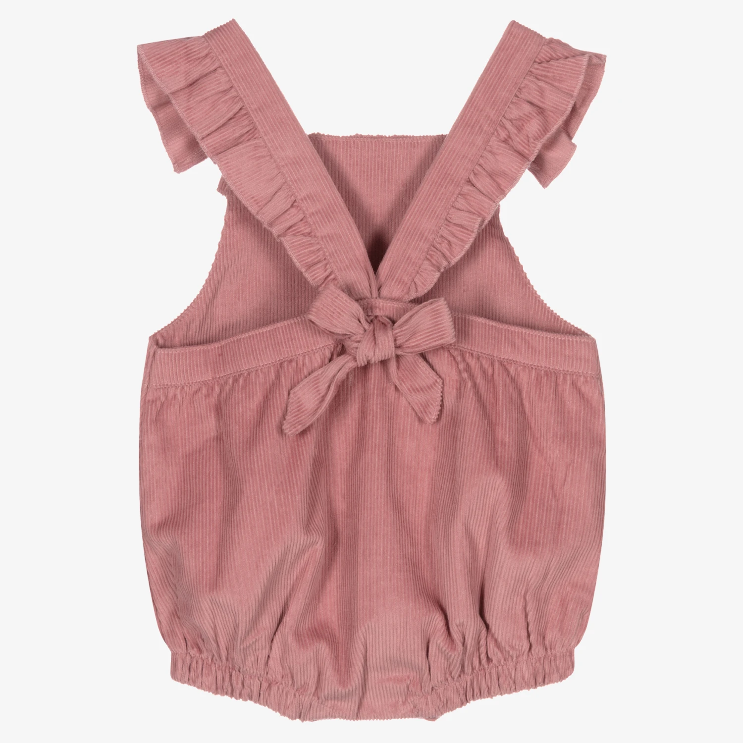 Gorgeous pink dungaree shortie for baby girls, from Lilly + Sid. Made in soft organic cotton corduroy, it has ruffle trims and adjustable shoulder straps that tie at the back.
