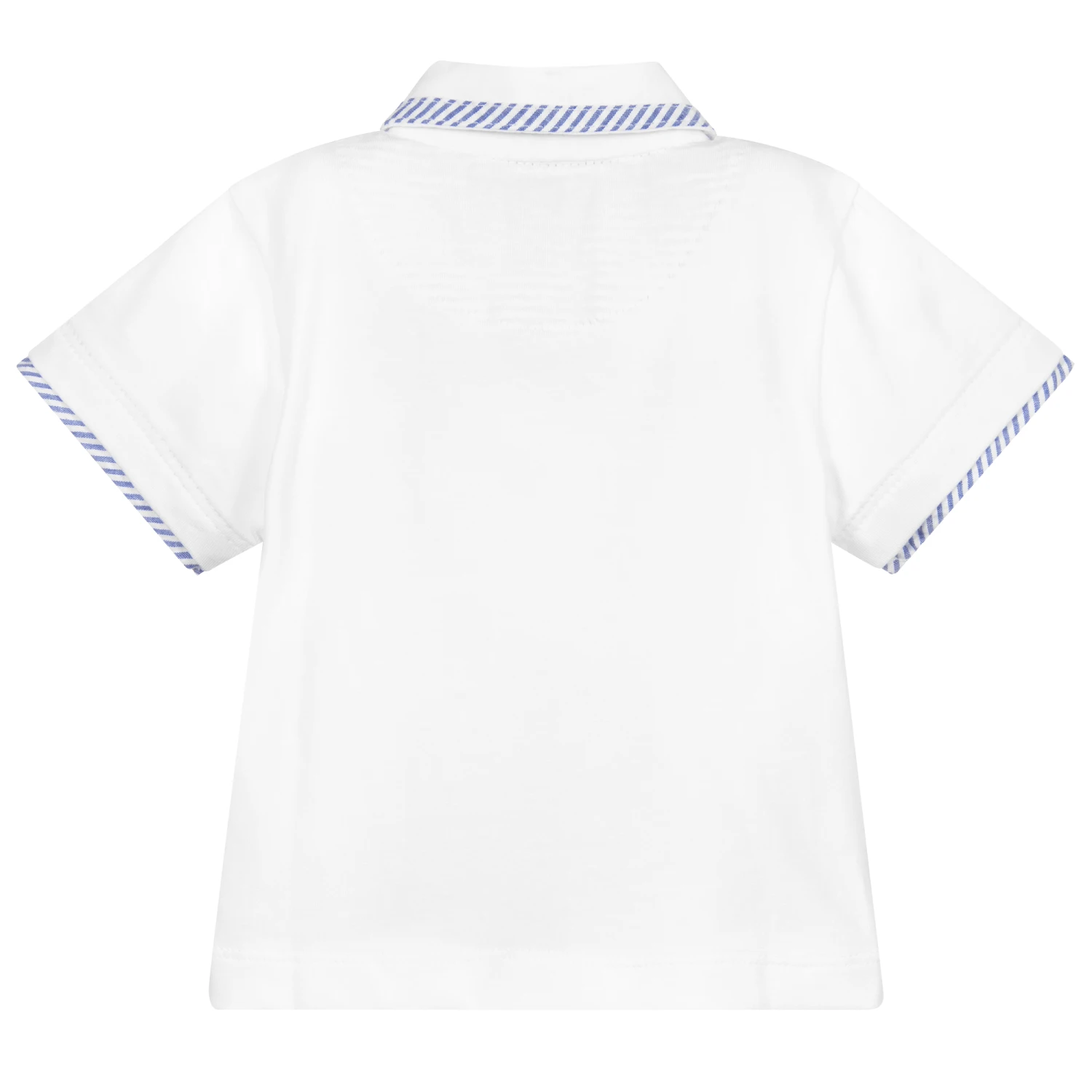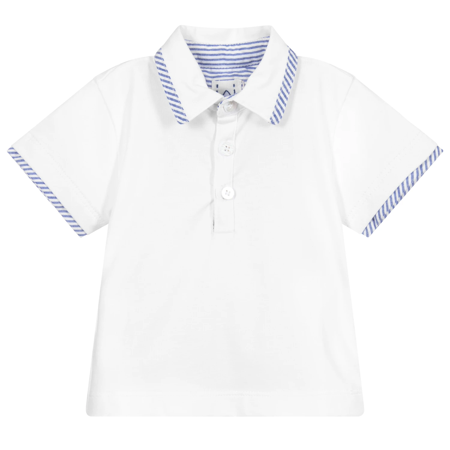 A smart polo shirt for baby boys by Malvi & Co, made in a soft cotton jersey. It has navy blue and white stripe trims, with button fastenings on the front.