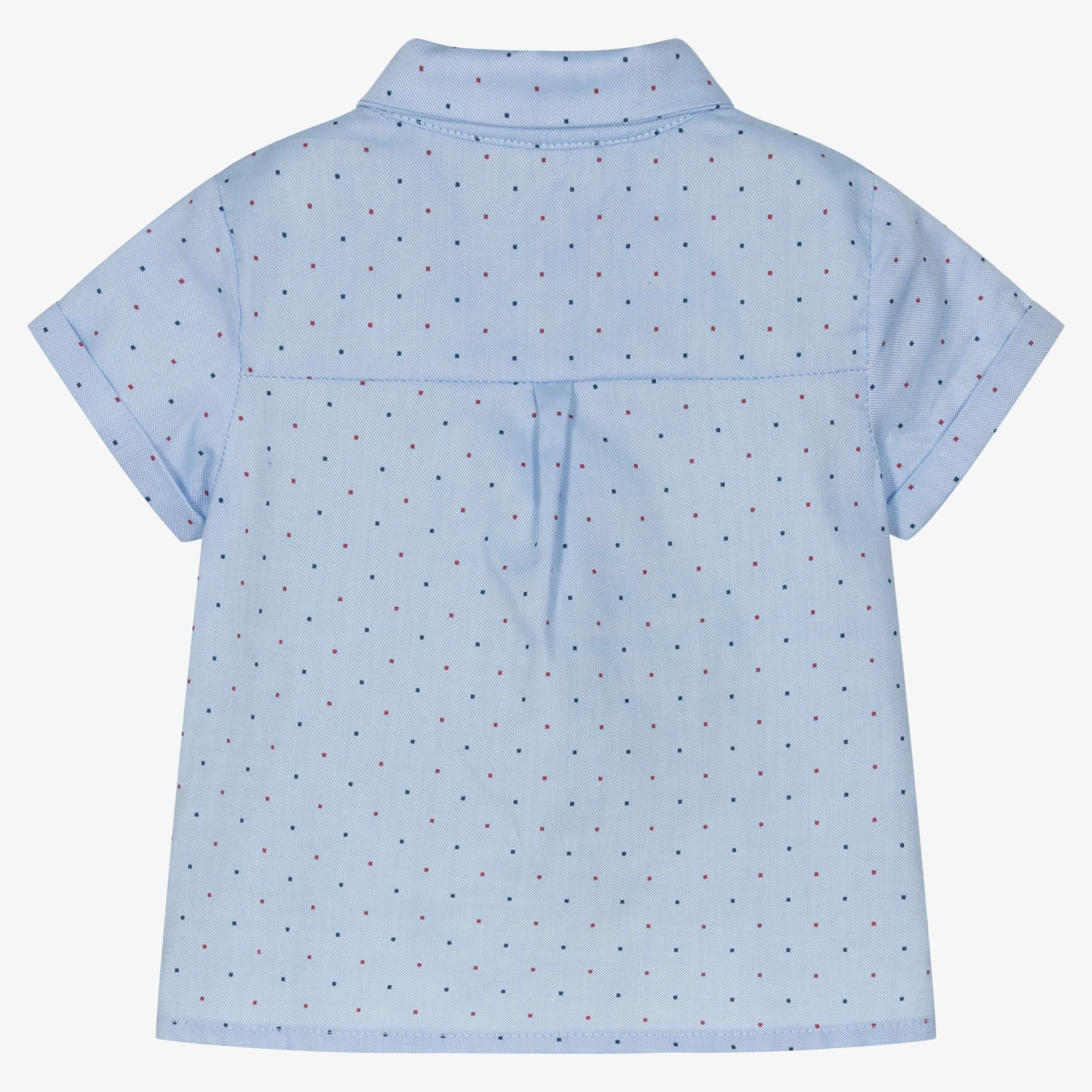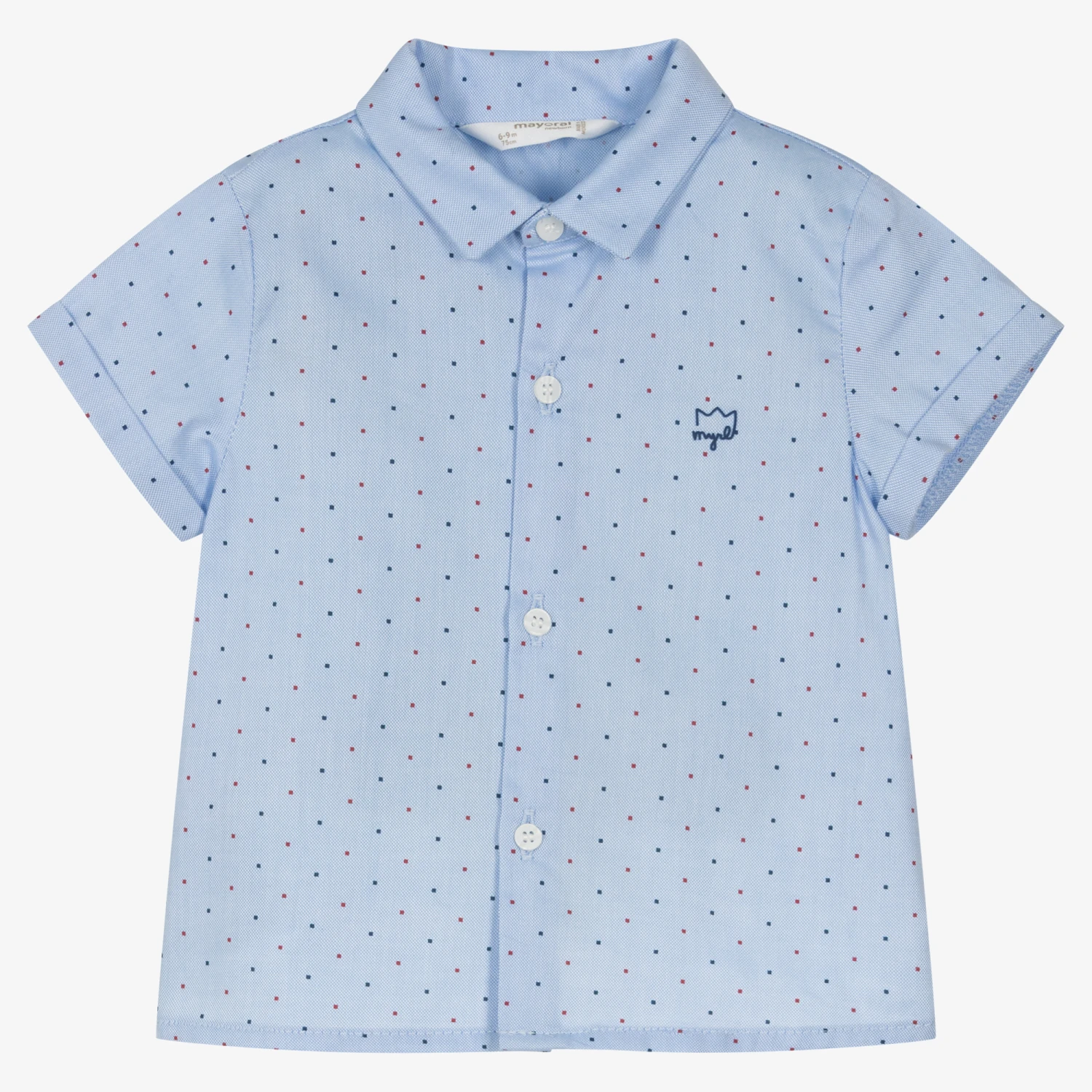 Blue short-sleeved shirt for baby boys, by Mayoral. Woven in soft organic cotton, it has a red and blue dotted pattern all-over and a rubberised logo on the chest. Fastening with useful buttons on the front, it has a crisp, pointed collar for a smart finish.