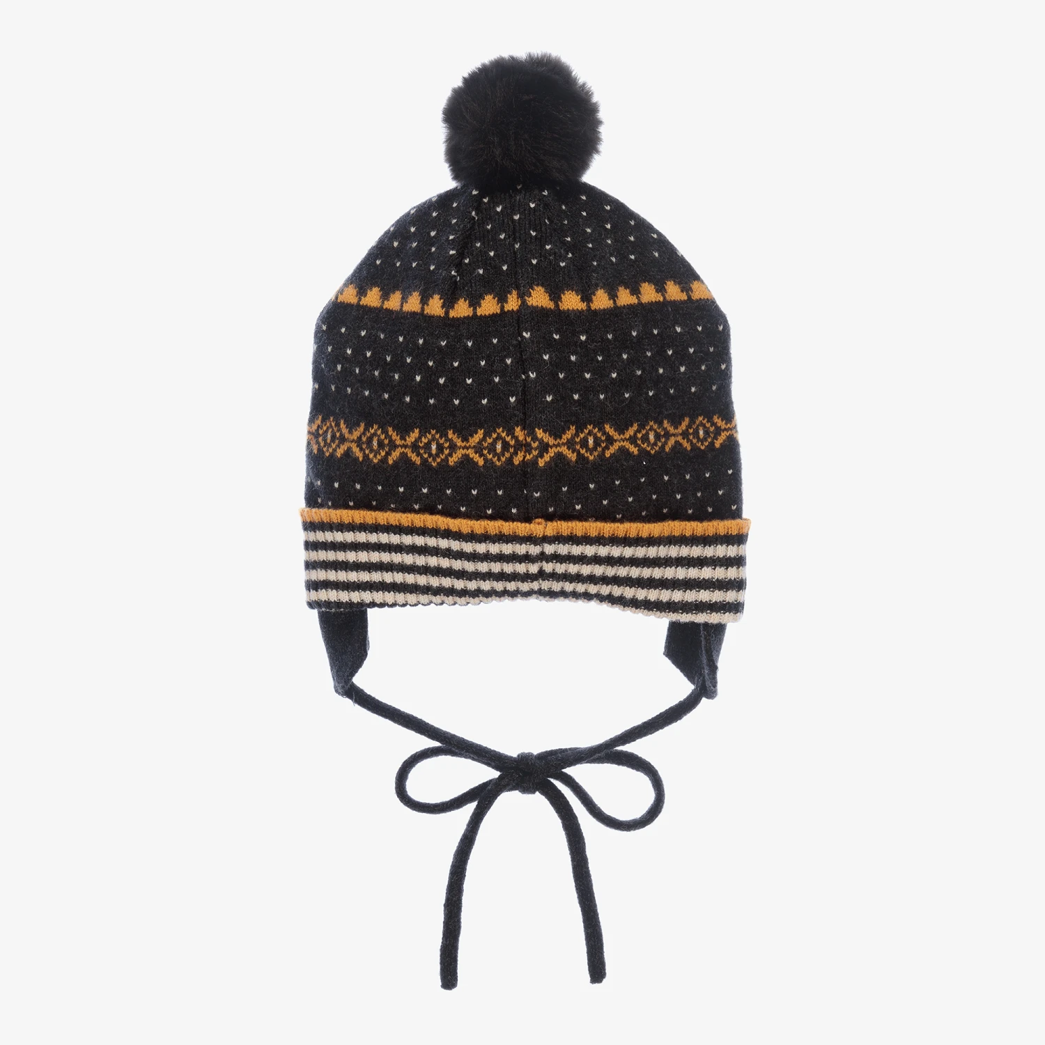 A charming yellow, beige and dark grey hat and scarf set for boys by Mayoral. Made in a super soft cotton blend the scarf has a cute tiger cub on one end with little appliqué paws. The matching hat has a ribbed turn-up and a soft grey, faux fur pom-pom on the top. It secures under the chin with ties.