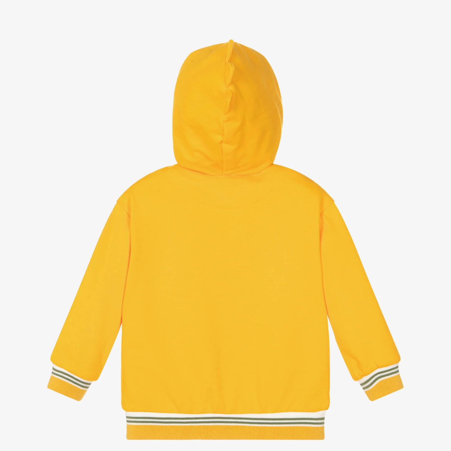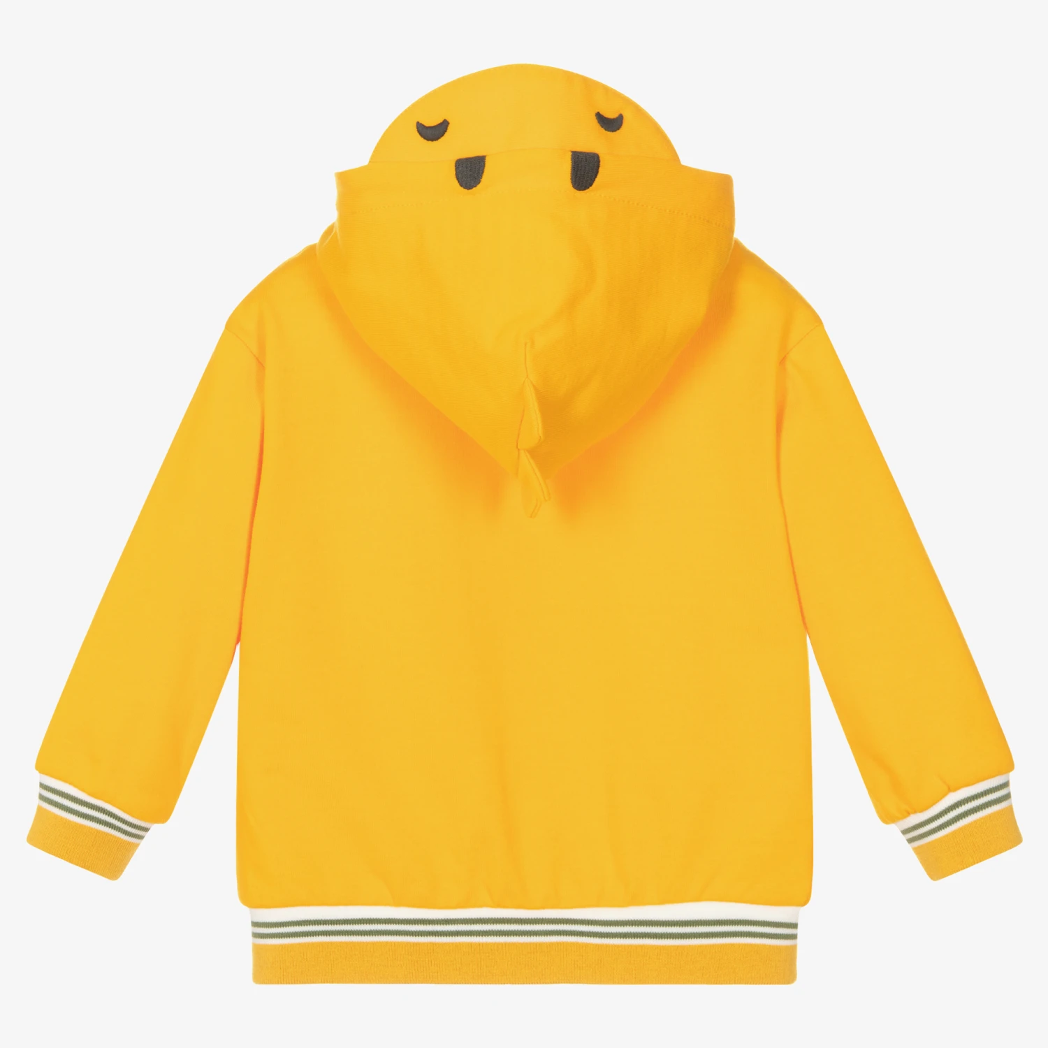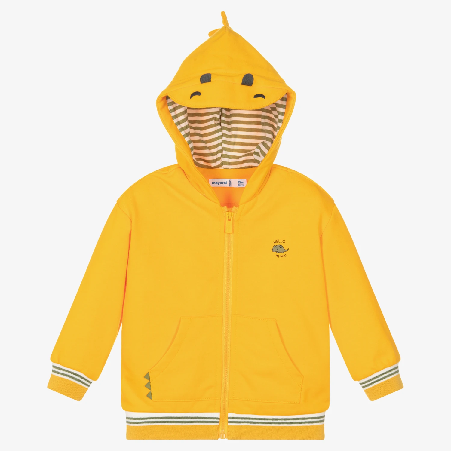 Casual orange zip-up hoodie by Spanish brand Mayoral, made in soft cotton jersey with a looped underside. This top has an adorable dinosaur face embroidered on the hood with spike appliqués, and a ‘Hello Mr Dino’ slogan on the chest. Cute and comfortable, it has a zip fastening, spikes appliquéd to one front pocket, and ribbed stripe trims.