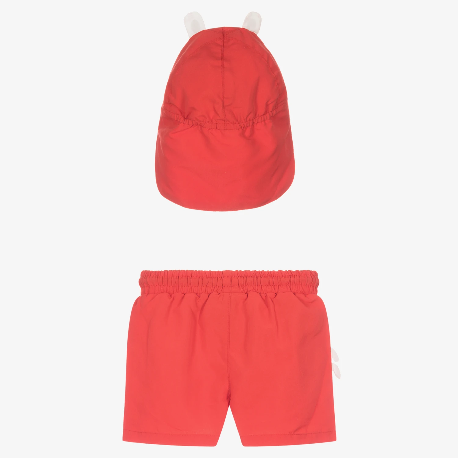 Red beach set for baby boys by Spanish brand Mayoral, with UPF40+. Made from recycled fibres with a breathable mesh lining, the swim shorts have an elasticated drawstring waistband, and a crab printed on the front with leg appliqués on the side. The sun hat has a peak on the front and a long flap on the back to protect baby’s neck and head. It has an adorable smiling face on the top, and an elasticated back.