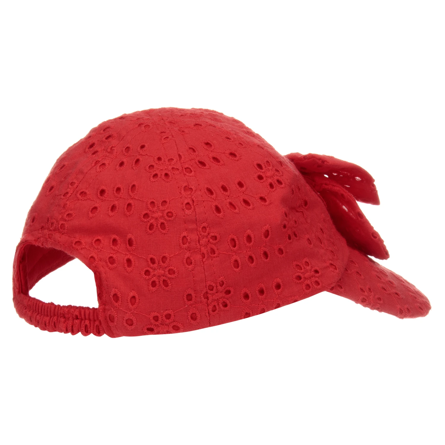 A red cap for baby girls by Mayoral, made in pretty broderie anglaise. It has a bow on the front and an elasticated strap around the back for a secure fit.