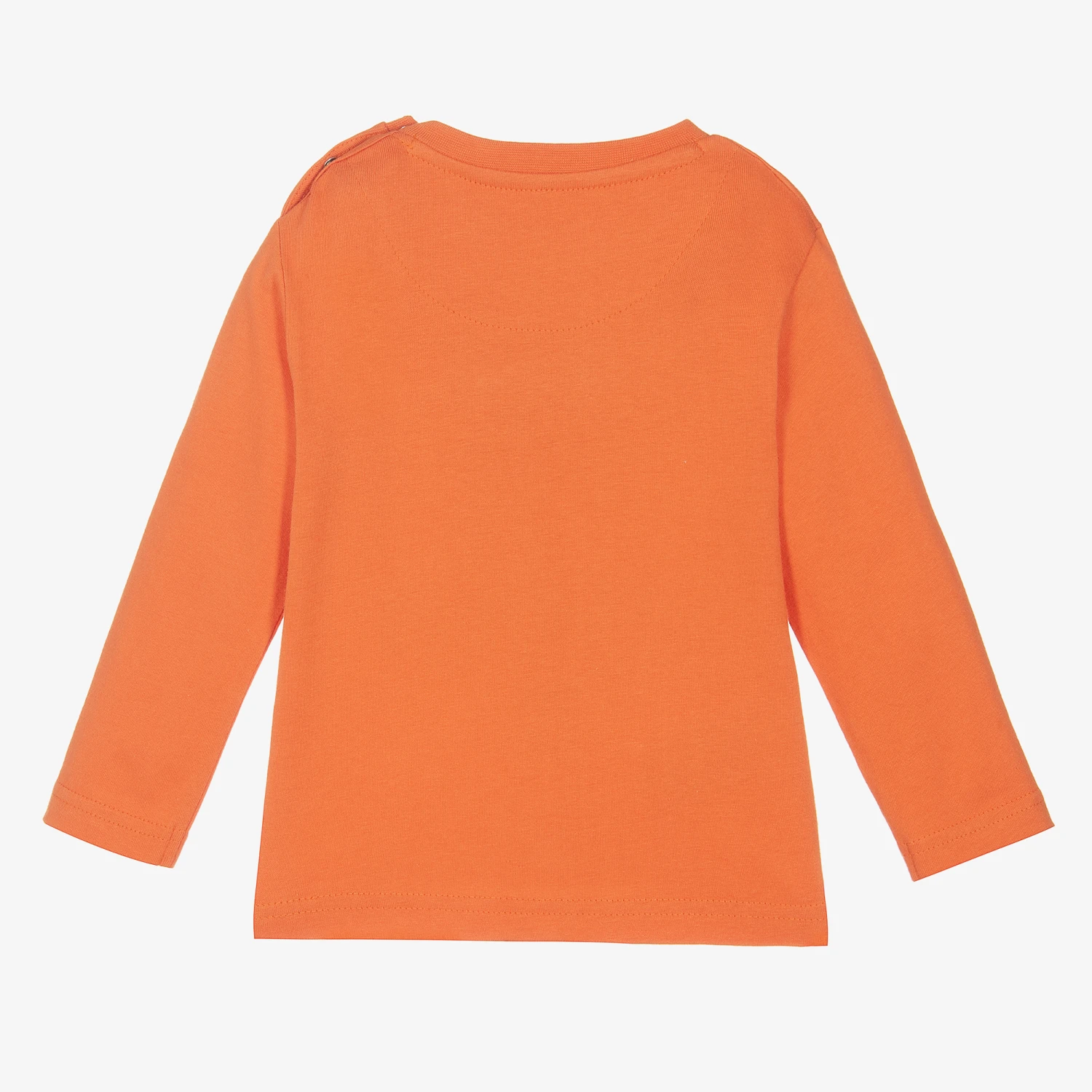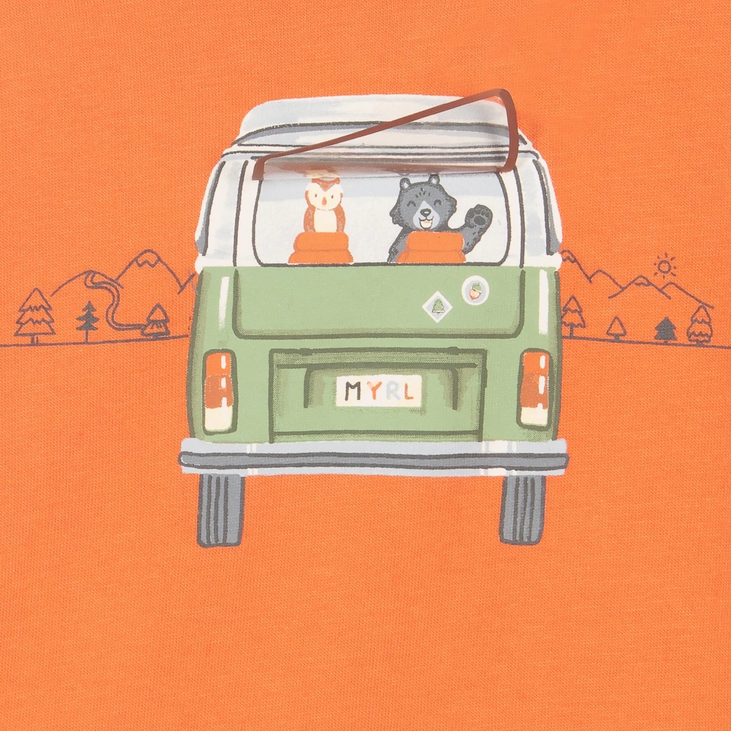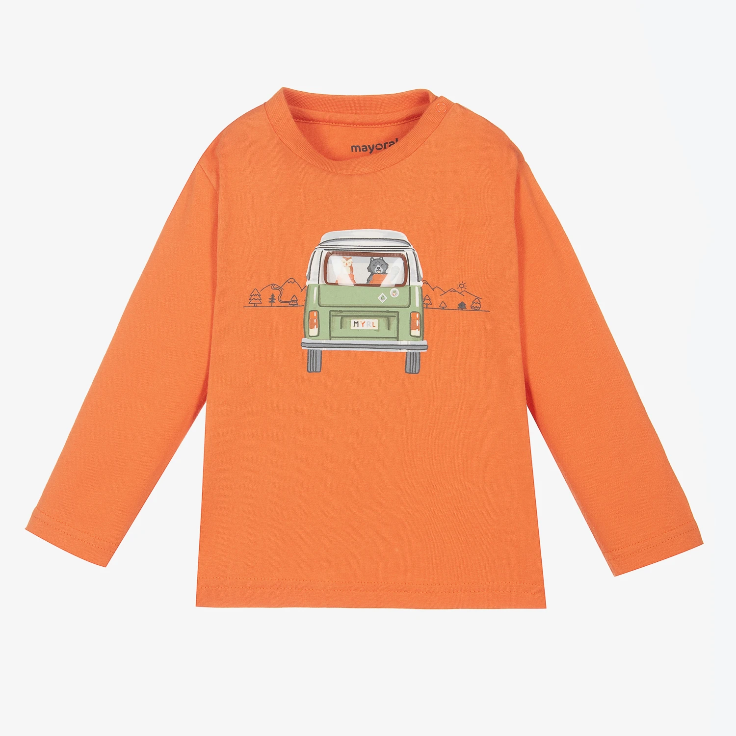 Little boys deep orange sustainable cotton top from Mayoral. Made in very soft, stretchy jersey, this long-sleeved top has a fun interactive camper van motif with little woodland animals beneath the clear ‘window’. There are popper fastenings on one shoulder for ease when dressing.