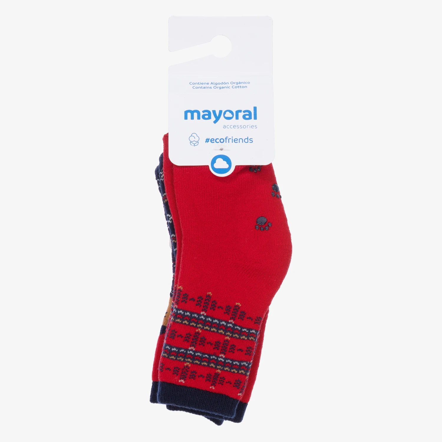 Pack of two pairs of red and navy blue cotton blend ankle socks for boys by Mayoral. One pair has a cute bear motif on the front. Warm and cosy, these thick socks both have navy blue paw shaped anti-slip pads on the soles. They are made with organic cotton in conversion.