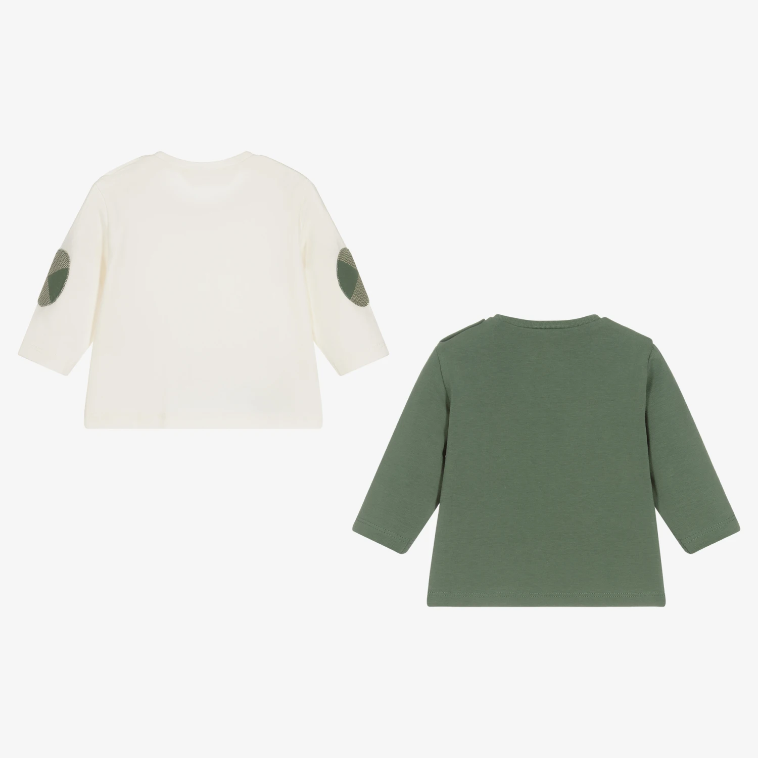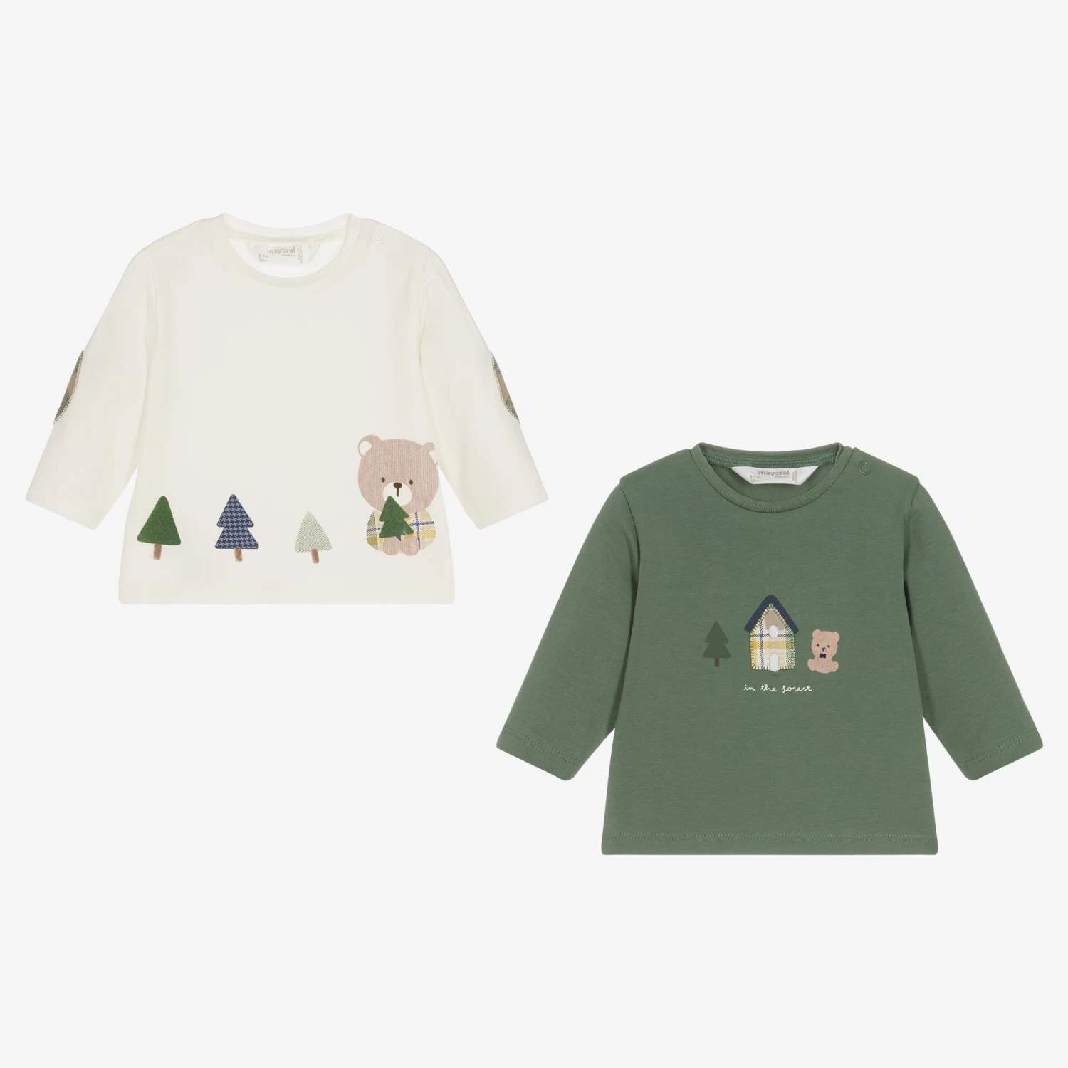 Two ivory and khaki green long-sleeved tops for baby boys by Mayoral Newborn, made in soft cotton jersey. Both have cute bear and tree appliqués and prints on the front and popper fastenings on one shoulder. The ivory top has green elbow patches. Both pieces are made using sustainable cotton.