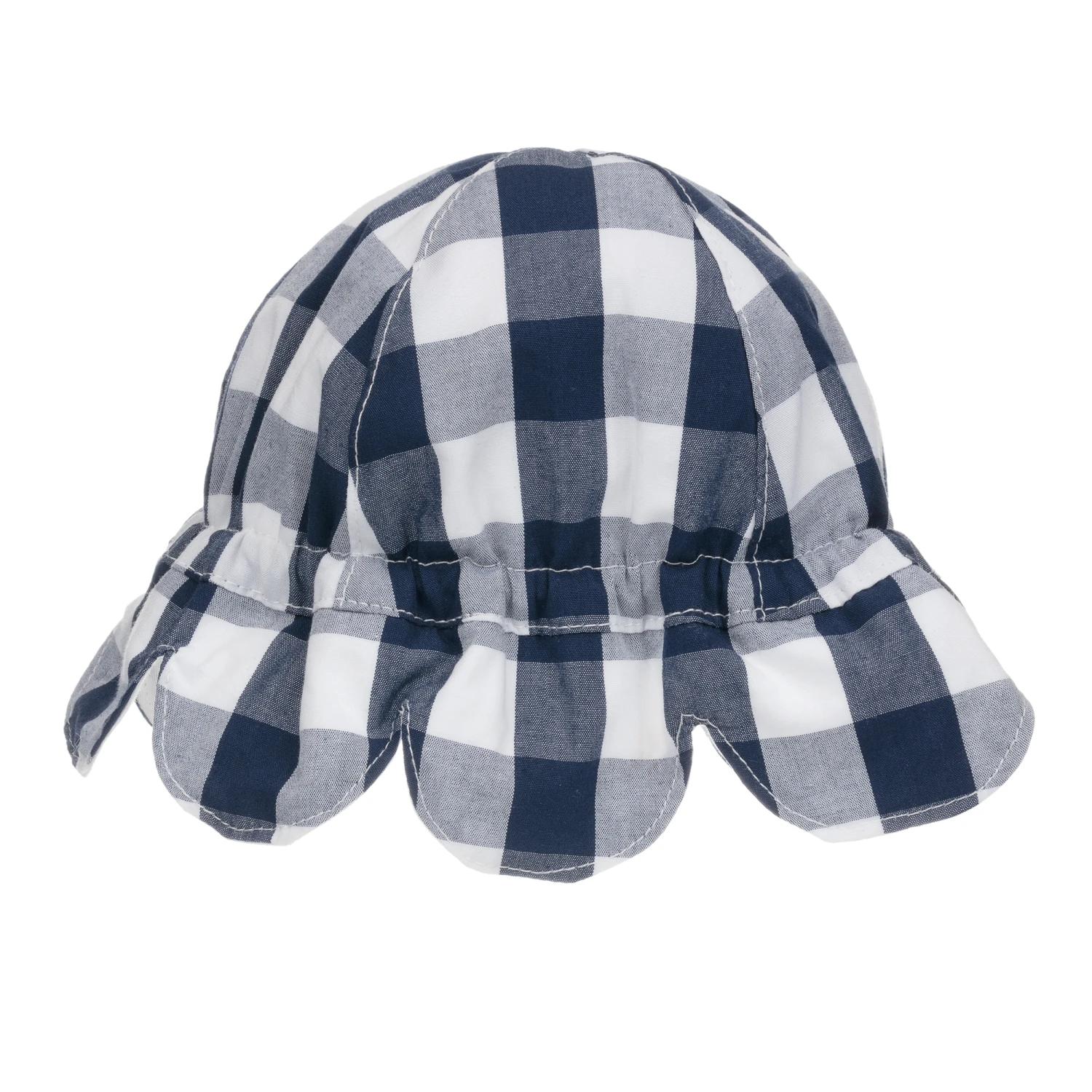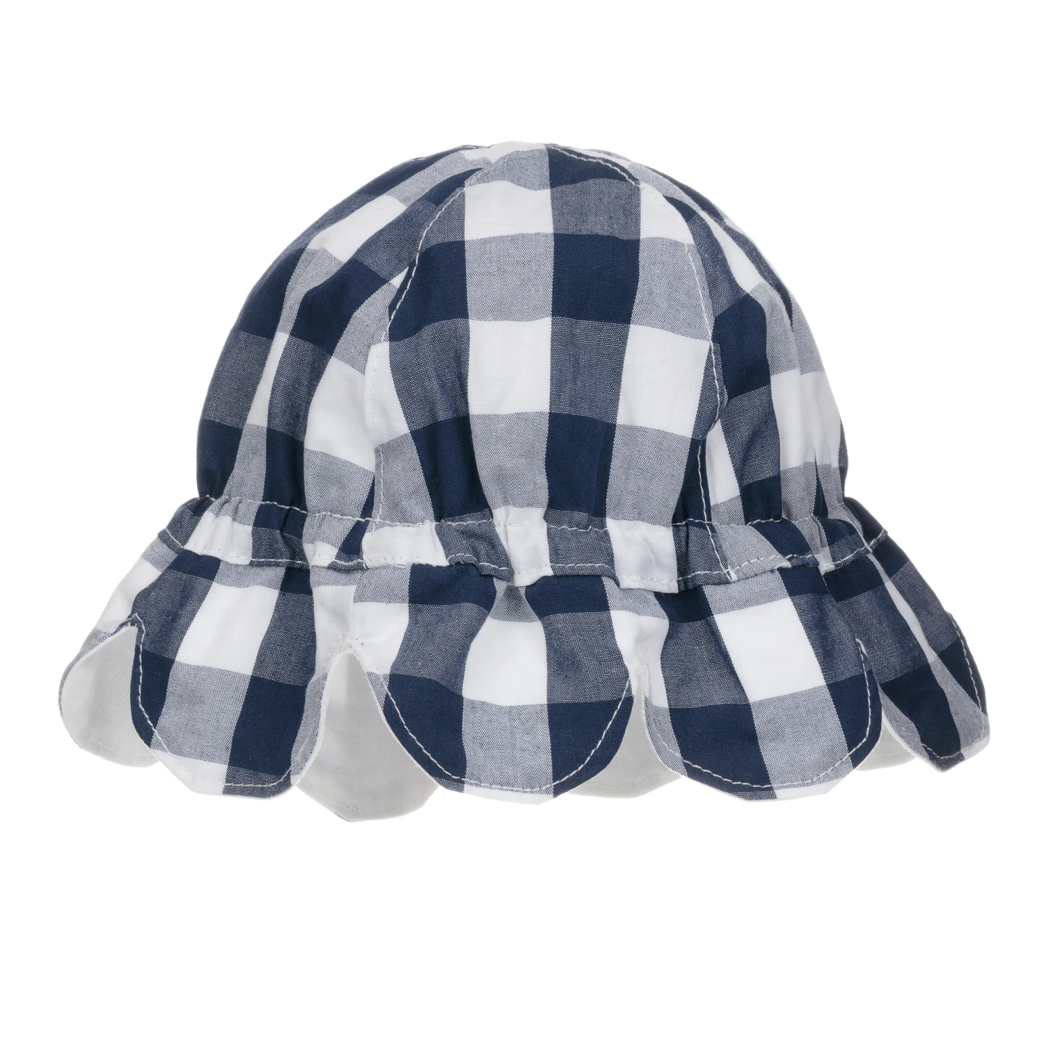 A sweet navy blue and white gingham hat for baby girls by Mayoral. Made in soft cotton with a scalloped brim, it is elasticated for a good fit.