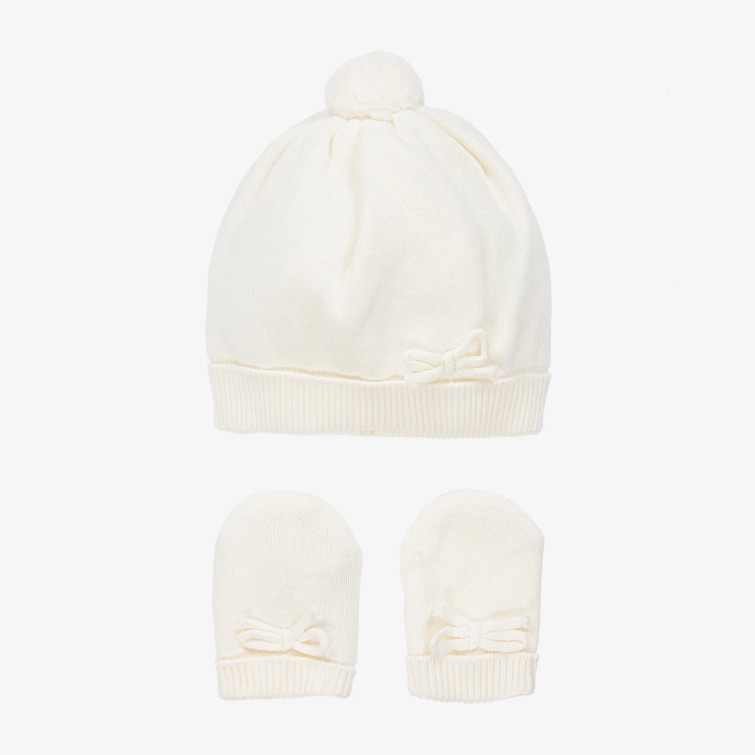 Baby girls ivory hat and mittens set by Mayoral. Finely knitted in sustainable cotton, this cosy winter set is soft and stretchy. There is a cute fluffy pom-pom on the hat. Both items have gently ribbed hems for a secure fit and the mittens have a sweet bow detail.