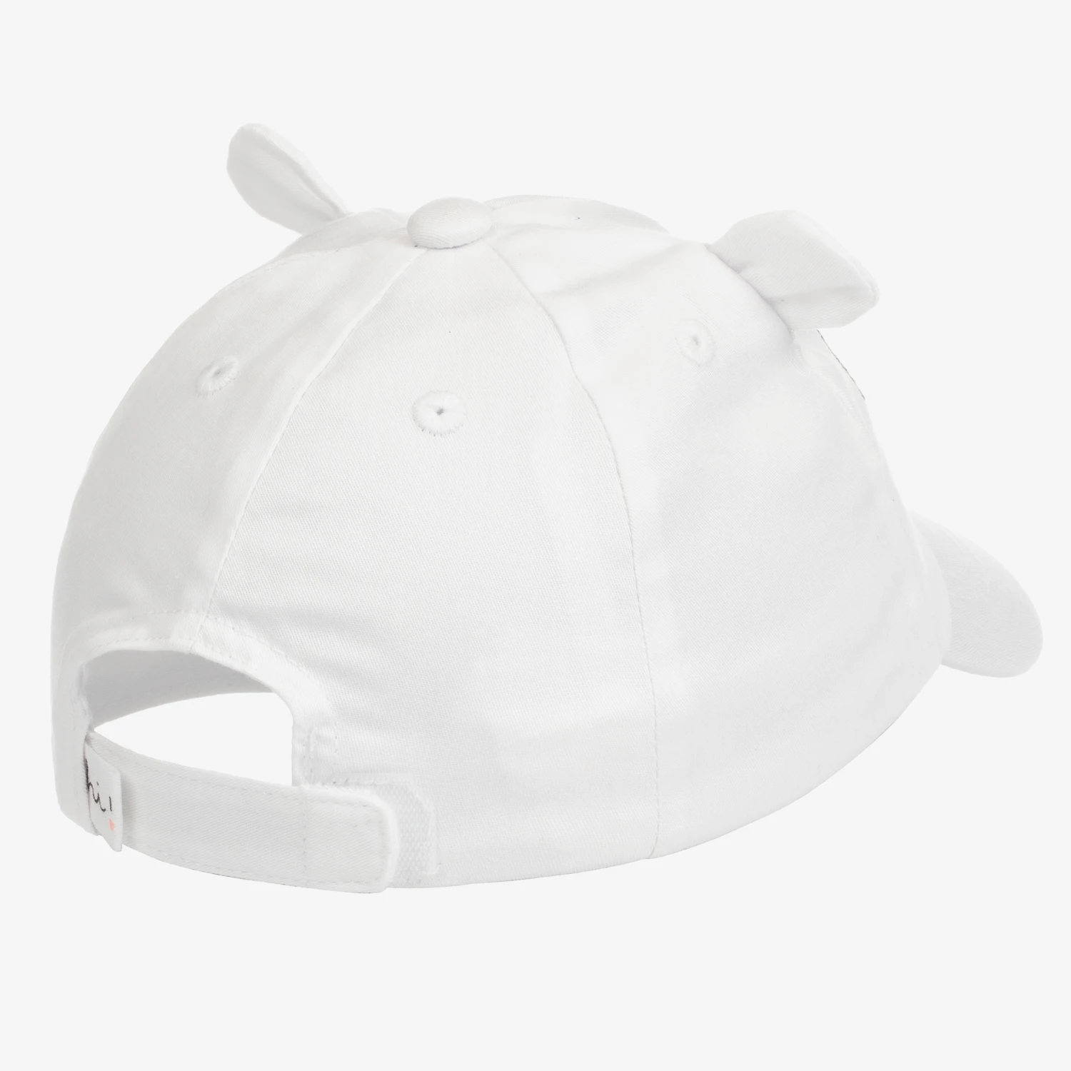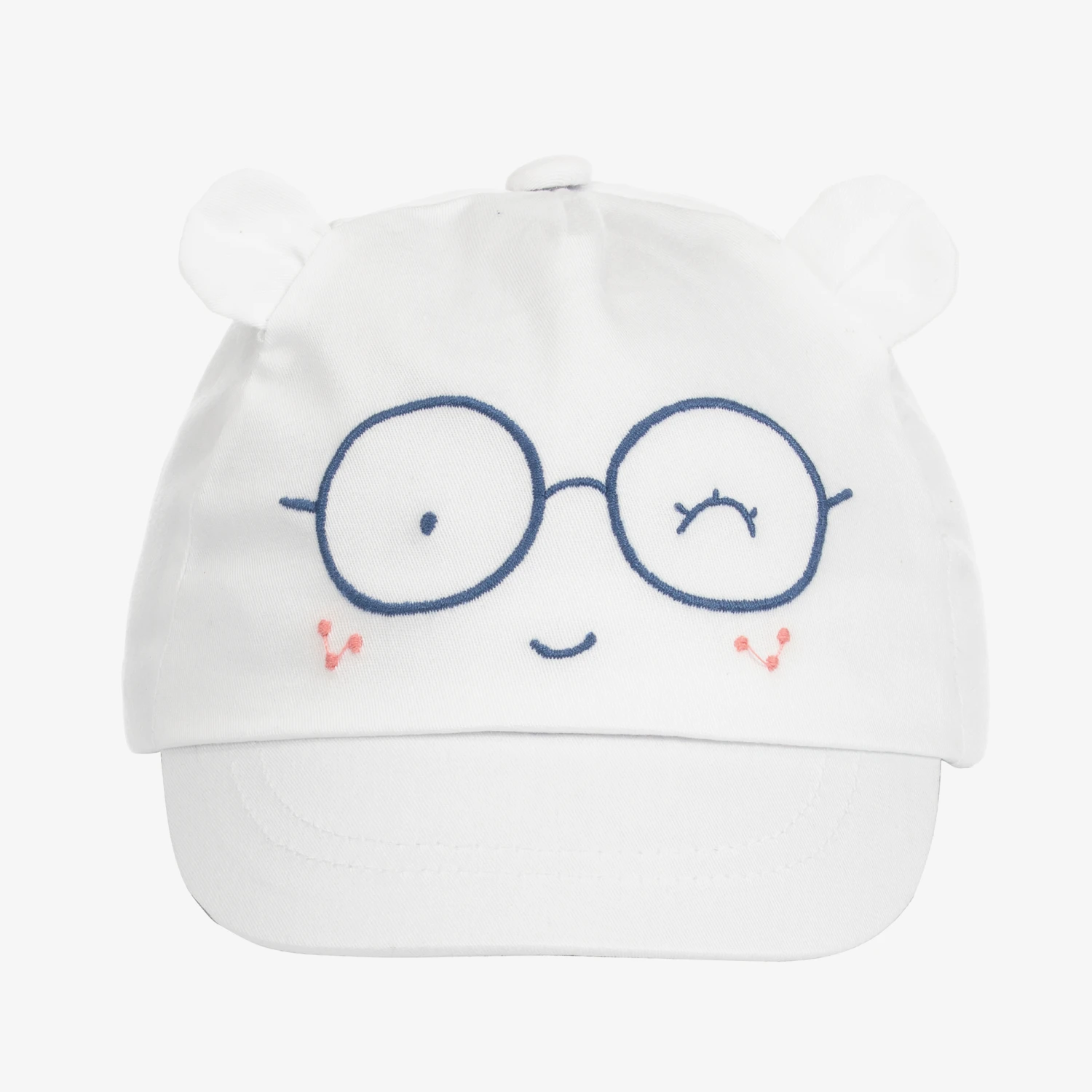 Cute white cap for baby girls, by Mayoral Newborn. Made in soft, lightweight cotton chambray, it has a sweet smiling face embroidered on the front with glasses, and cute 3D bear ears on the top. Lined with white cotton, it has a velcro strap fastening on the back for a secure fit.