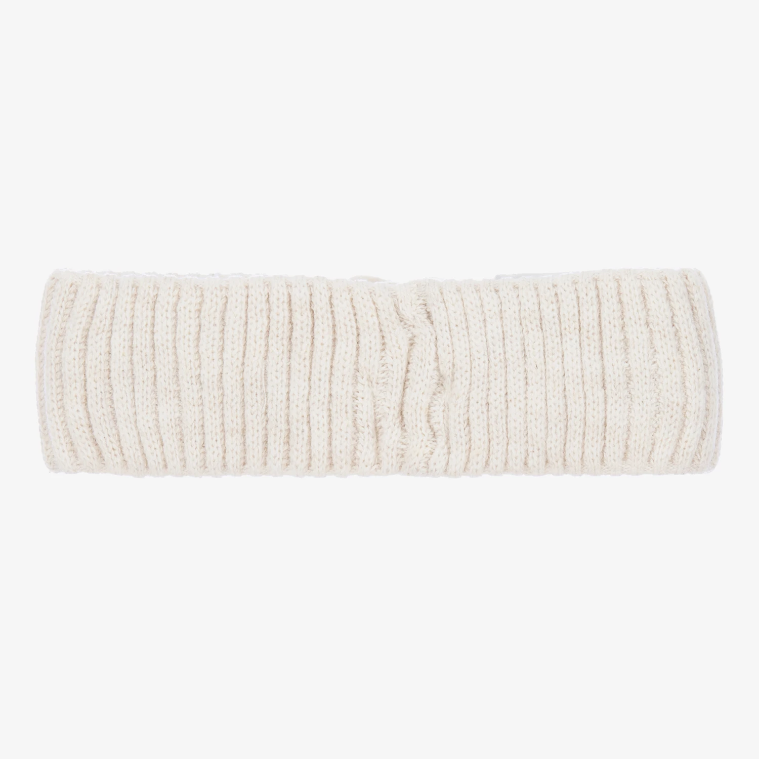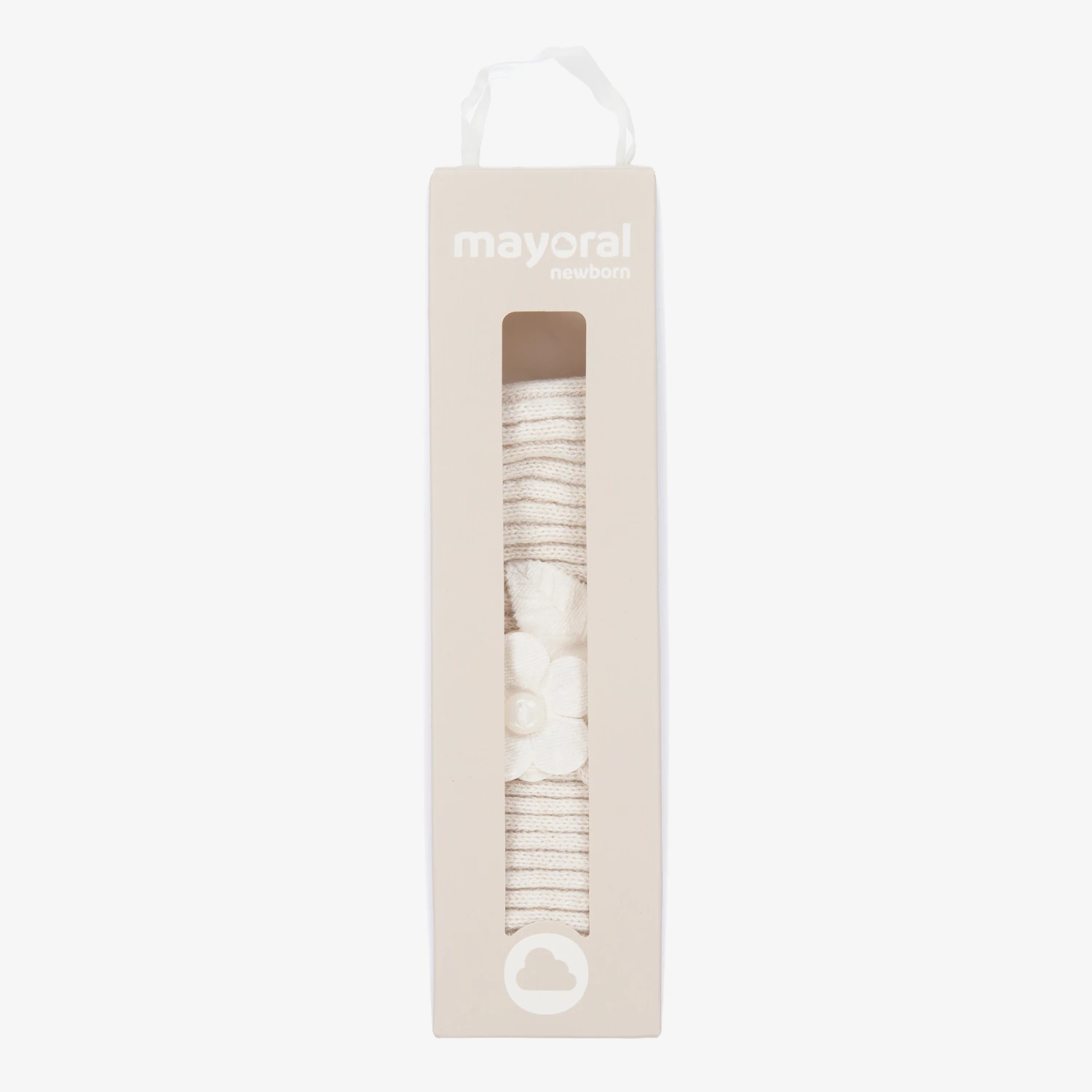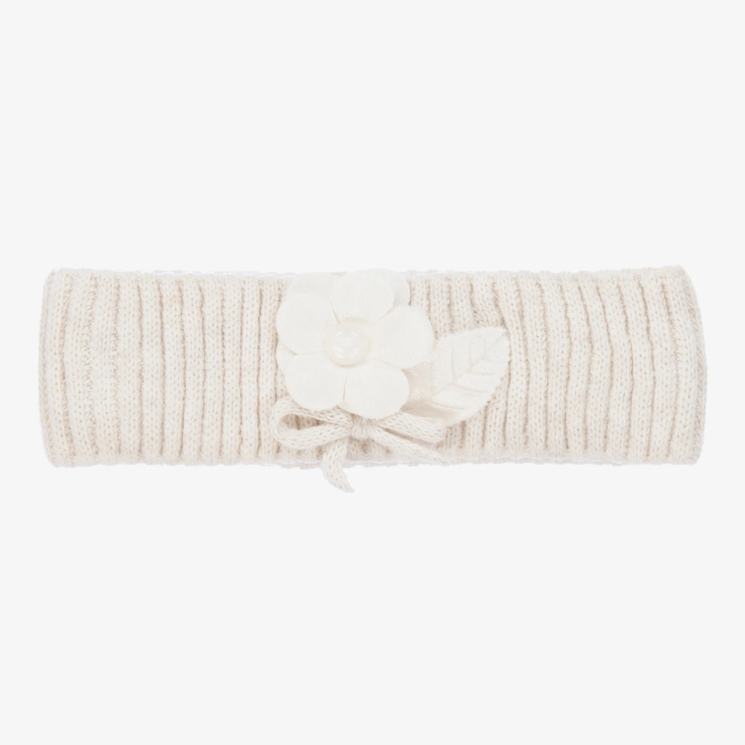A pretty beige headband for baby girls by Mayoral Newborn. Made in super soft knitted cotton, it is ribbed and stretchy, with a velvety flower appliqué on the top.