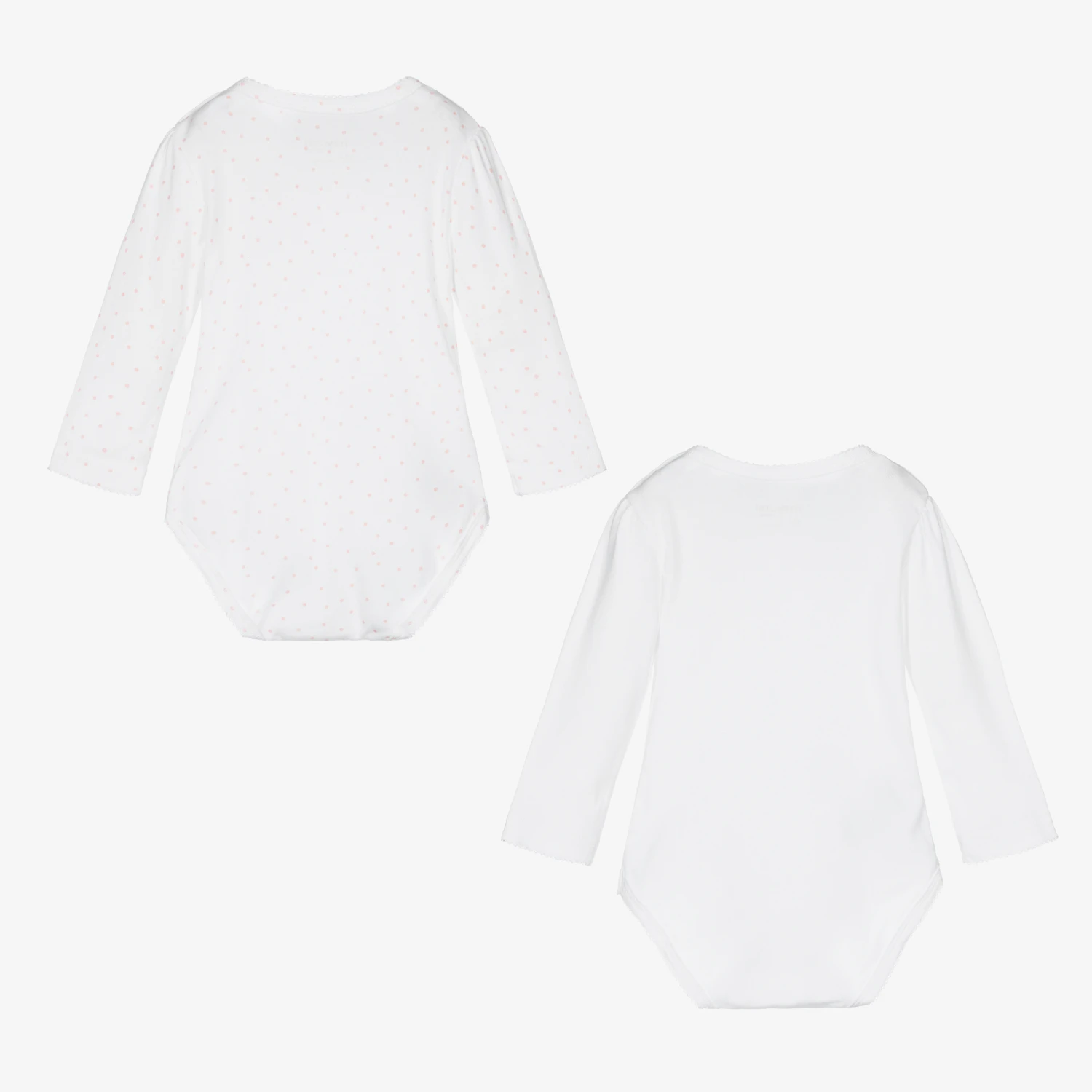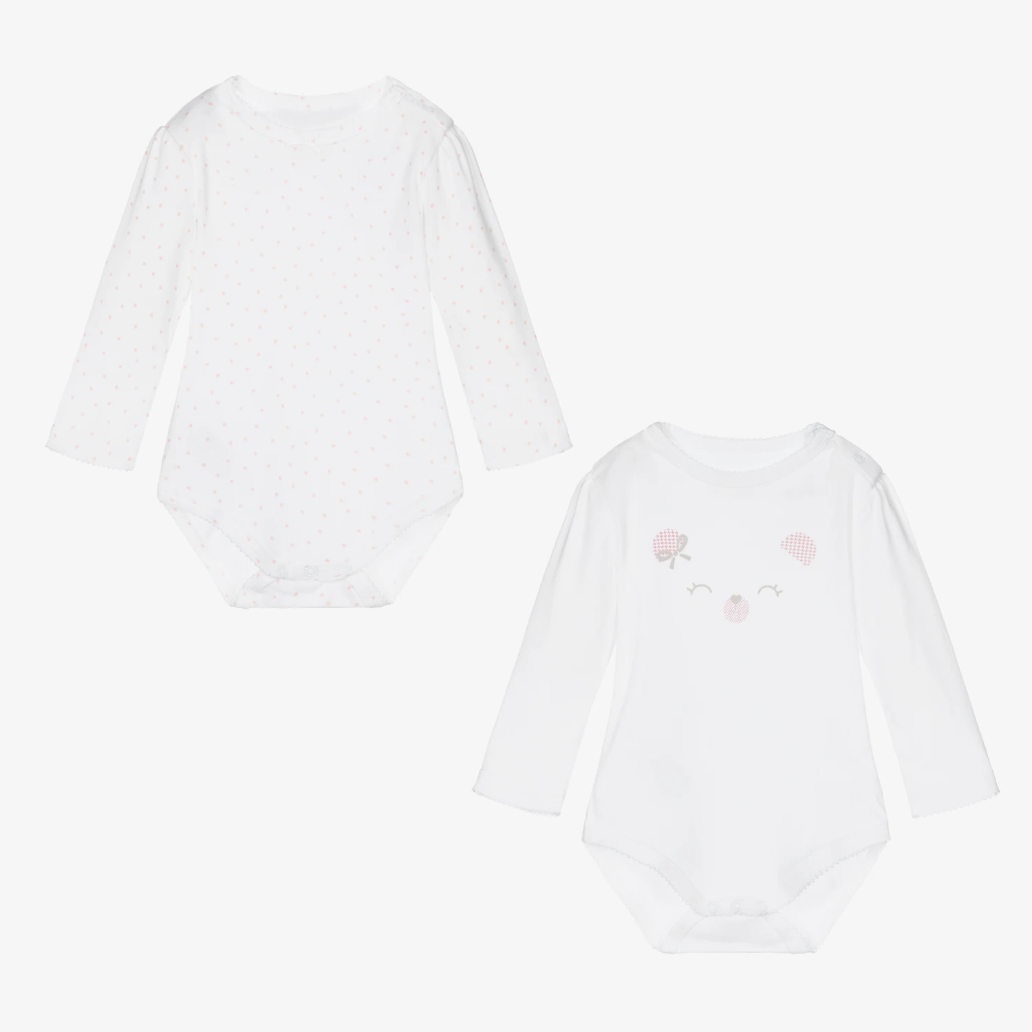 Pack of two white bodyvests for girls by Mayoral Newborn. Made in soft cotton jersey, one has a sweet bear’s face printed on the chest, while the other is patterned with light coral pink polka dots throughout. Both fasten at the shoulder and between the legs with poppers and have scalloped lace trims.