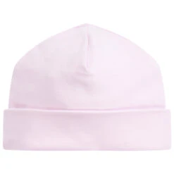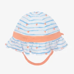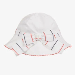Red hat for baby girls by Mayoral. Made in soft cotton, it has a pleated brim with a pretty bow detail. It secures with ties under the chin.