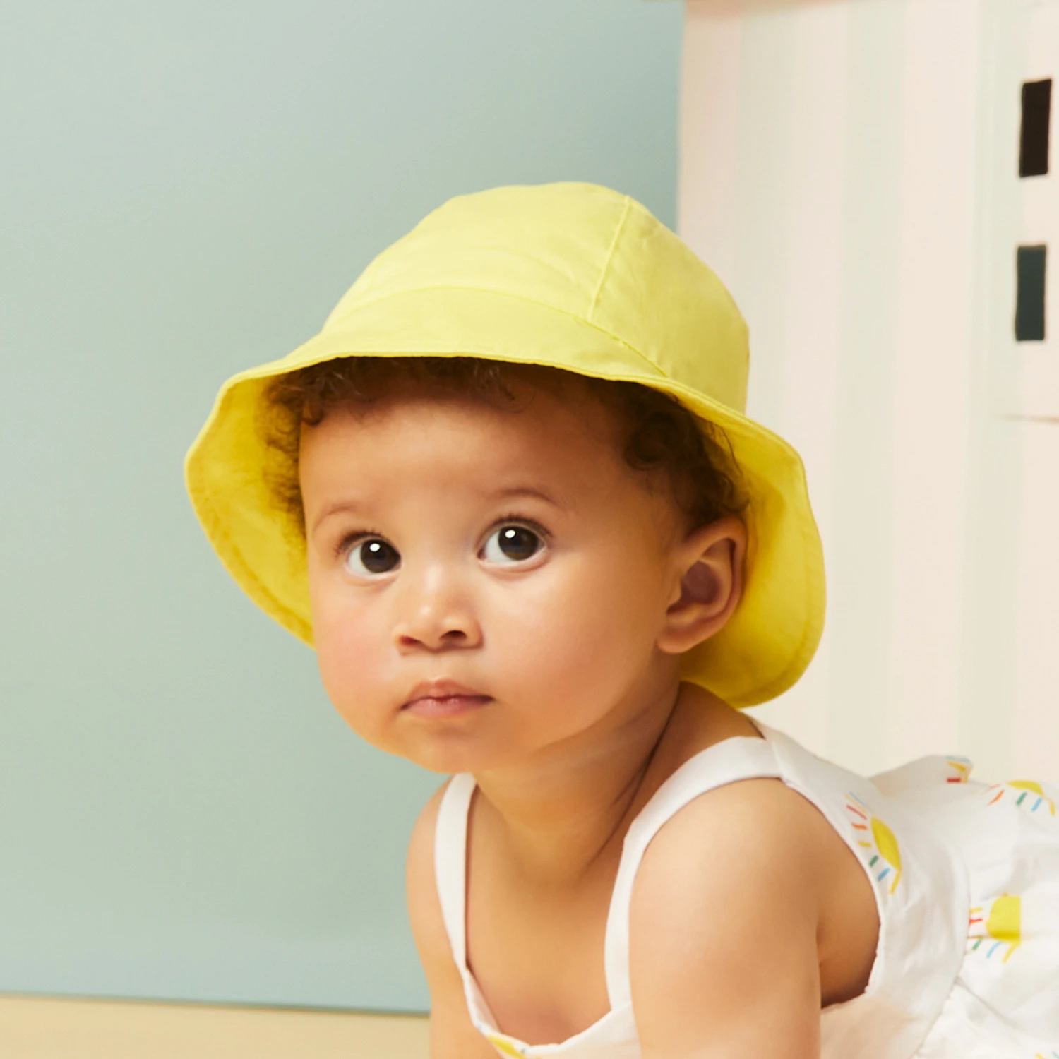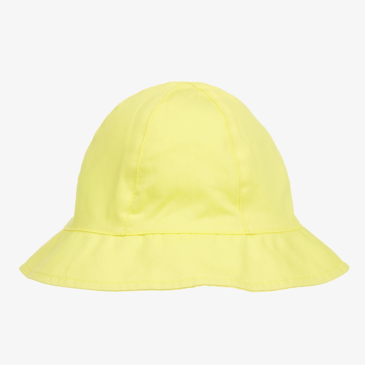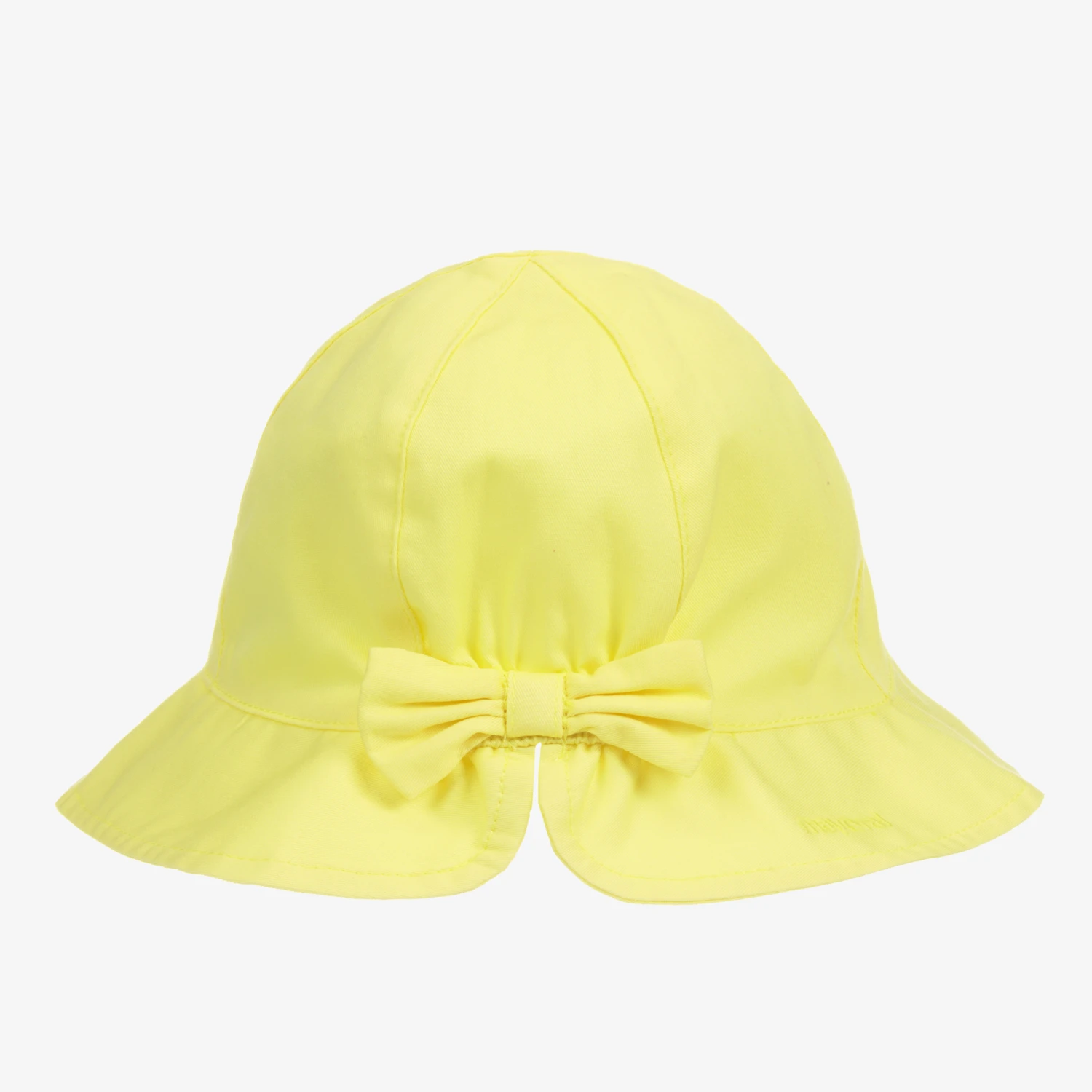 Yellow cotton sun hat for baby girls by Mayoral. Soft and lightweight, there is a lovely bow on the back and a tonal yellow embroidered logo on the brim. It has a gently elasticated section at the back for a comfortable fit.