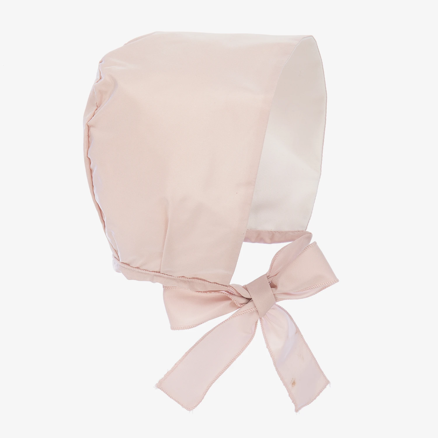 Baby girls pink bonnet from Mebi, made in polyester satin. It has an ivory twill lining and satin ribbon ties.