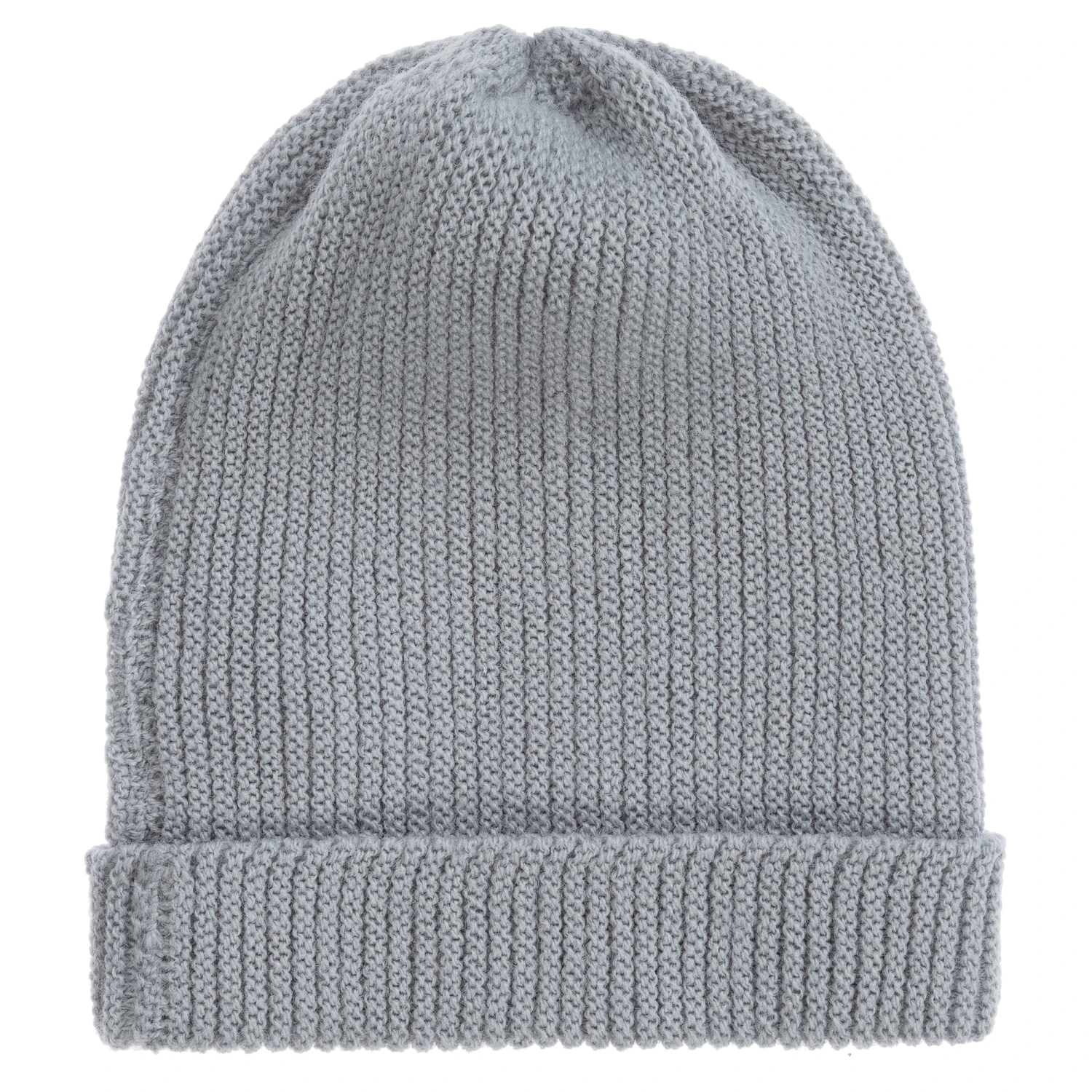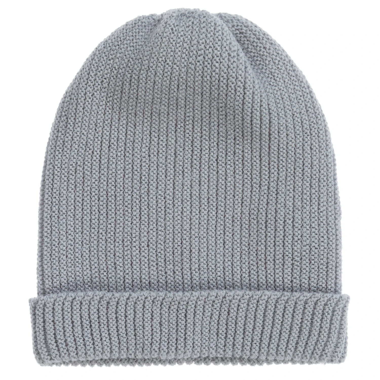 From Mebi, a slate blue beany hat for baby boys and girls, made in softly knitted acrylic with a turn-up brim.