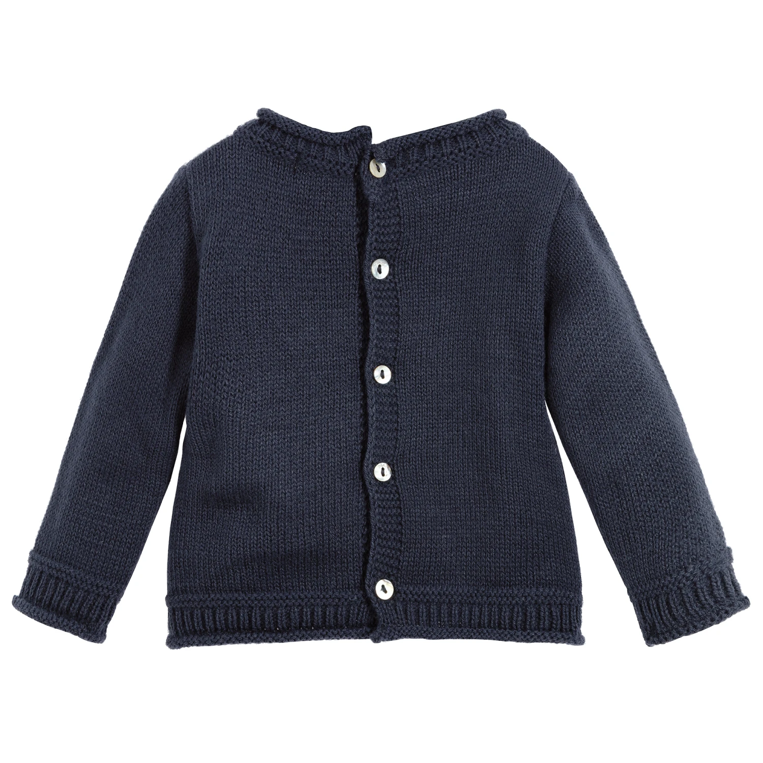 From Mebi, a dark blue jumper for baby boys and girls, made in softly knitted acrylic. With roll-edge ribbing on the collar, cuffs and hem, it has a pocket on the front with a decorative wooden button, and button fastening on the back.