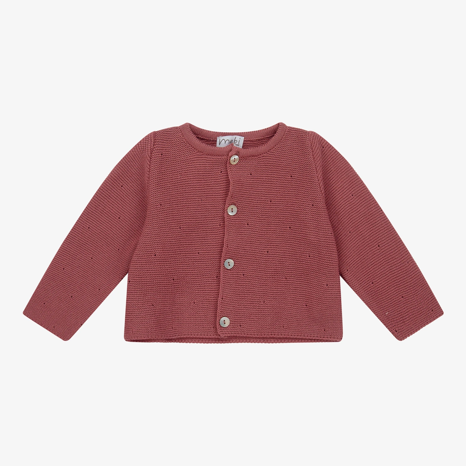 Dark pink cardigan for baby girls by Spanish brand Mebi, finely knitted in soft cotton. It has mother-of-pearl button fastenings on the front.