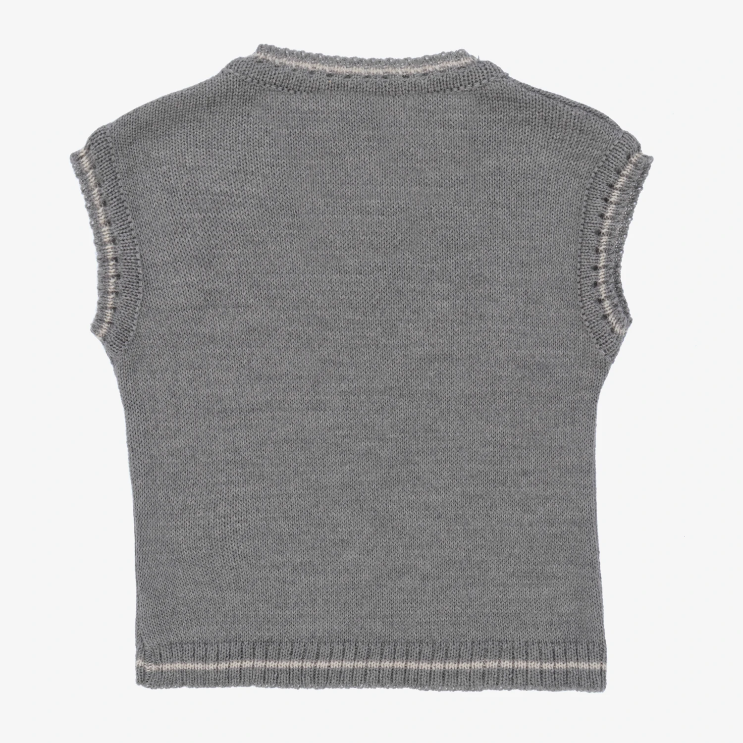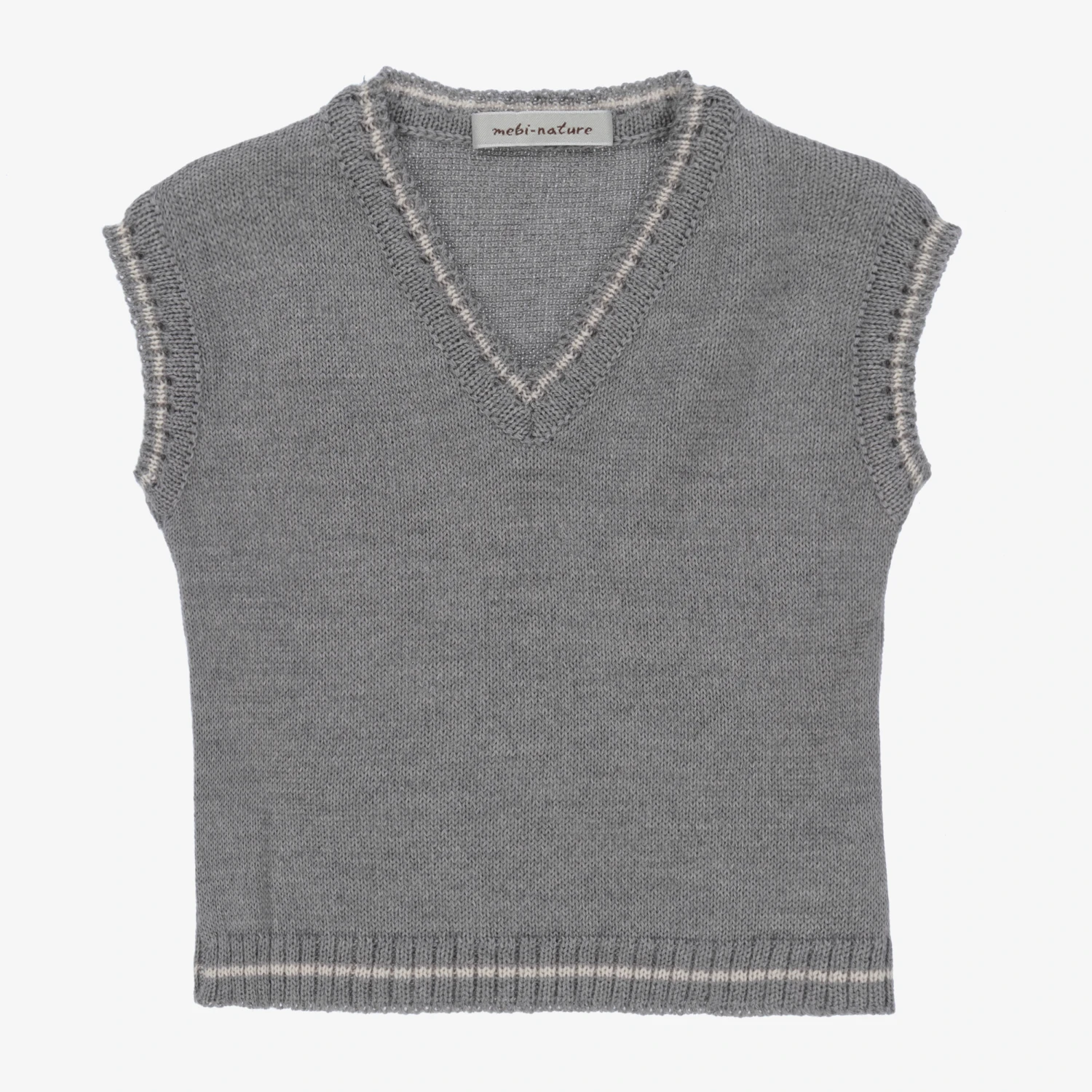 Baby boys grey knitted slipover top by Spanish brand, Mebi. Made from soft Merino wool, it has a V-neck and white stripes on the ribbed trims.