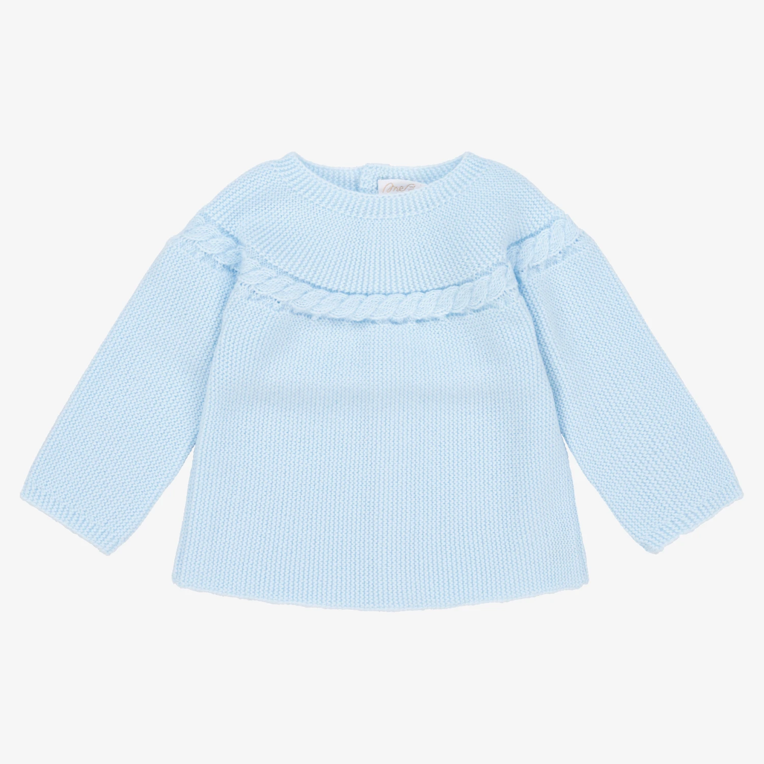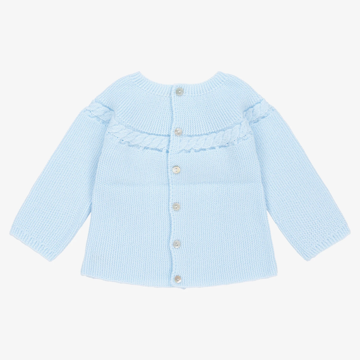 A lovely pale blue sweater for baby boys and girls is by Mebi. In a beautiful soft knit, it has cable stitch detailing and fastens with traditional mother-of-pearl buttons on the back.