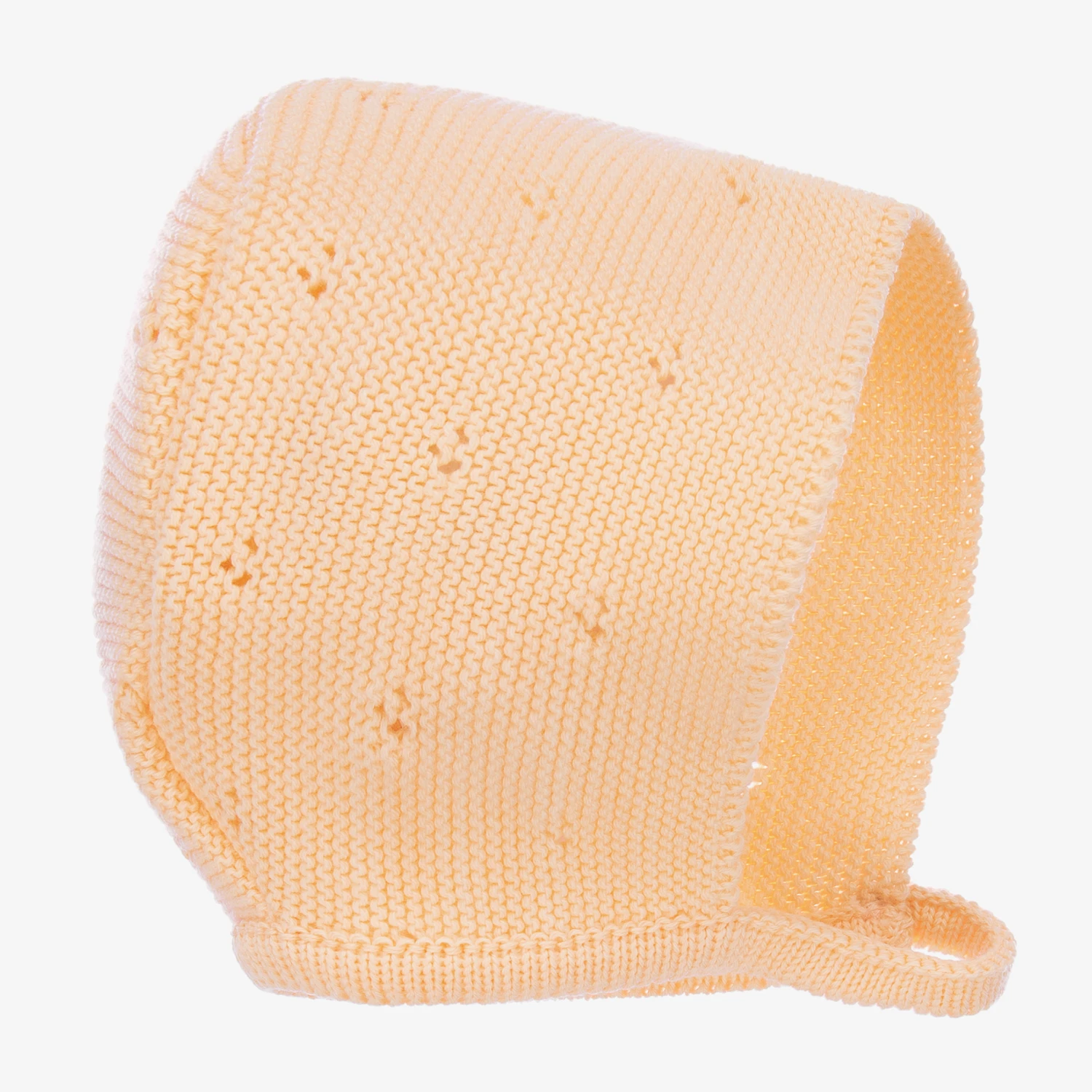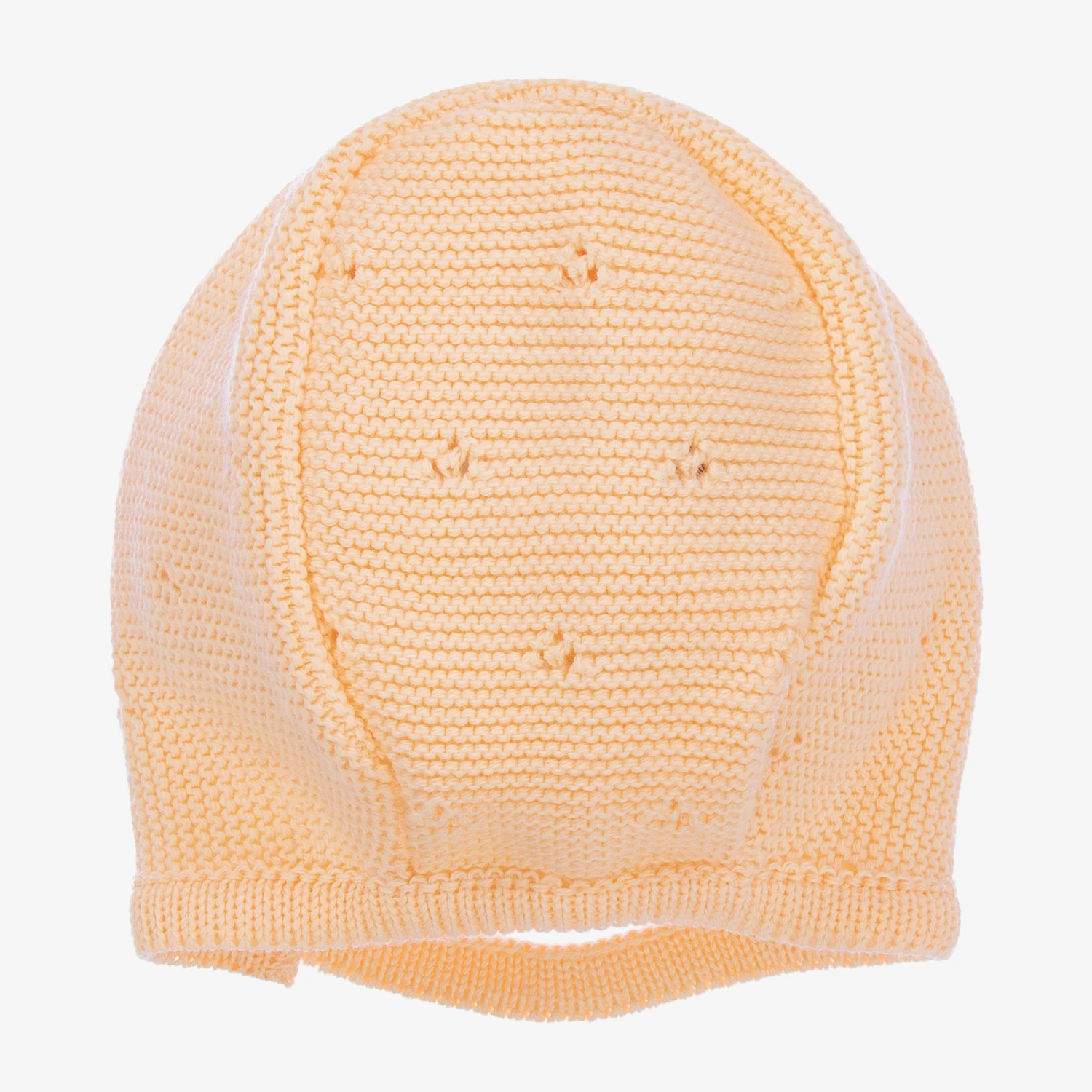 Cute pale coral orange bonnet for baby girls by Mebi, knitted from soft cotton and fastening under the chin with a button fastening strap.