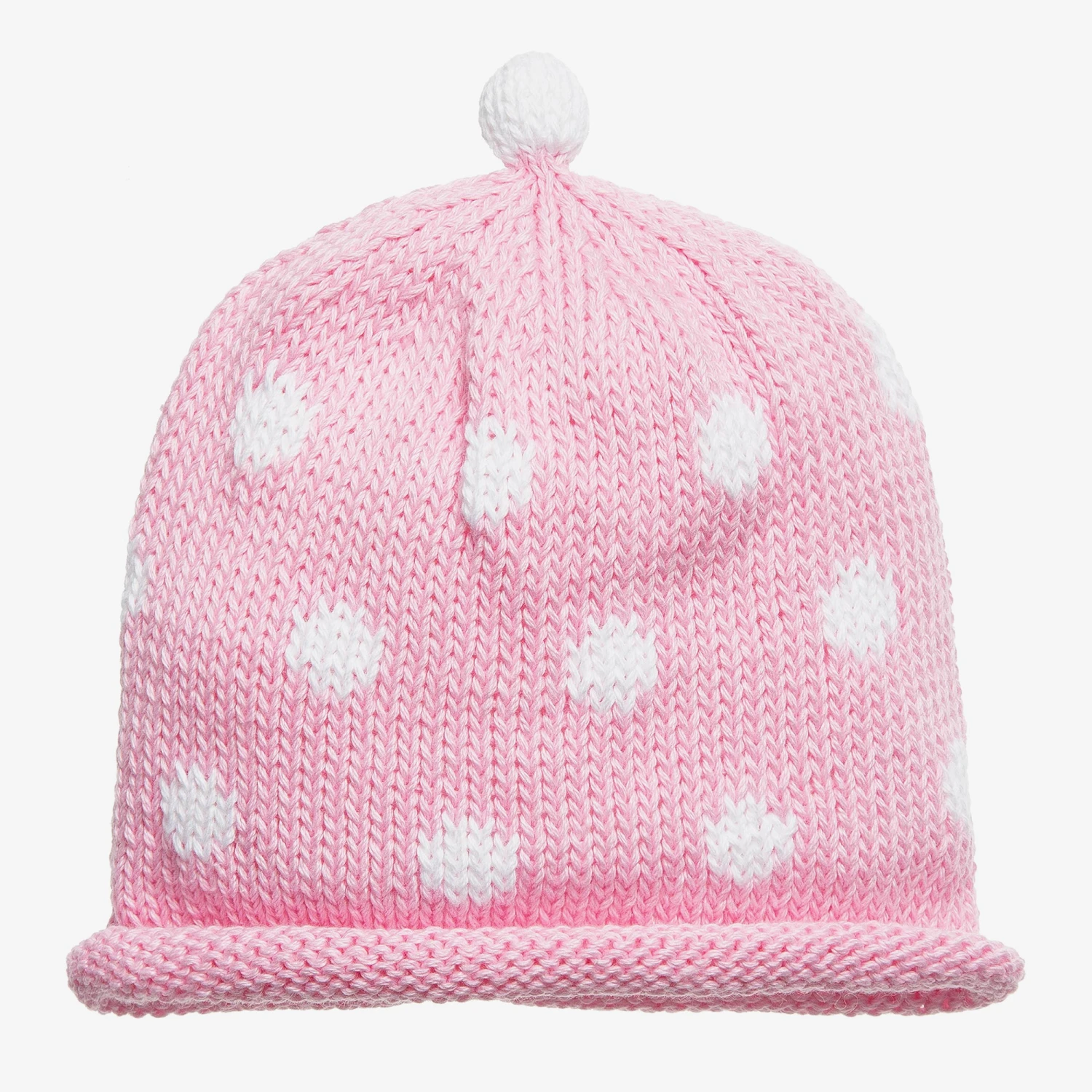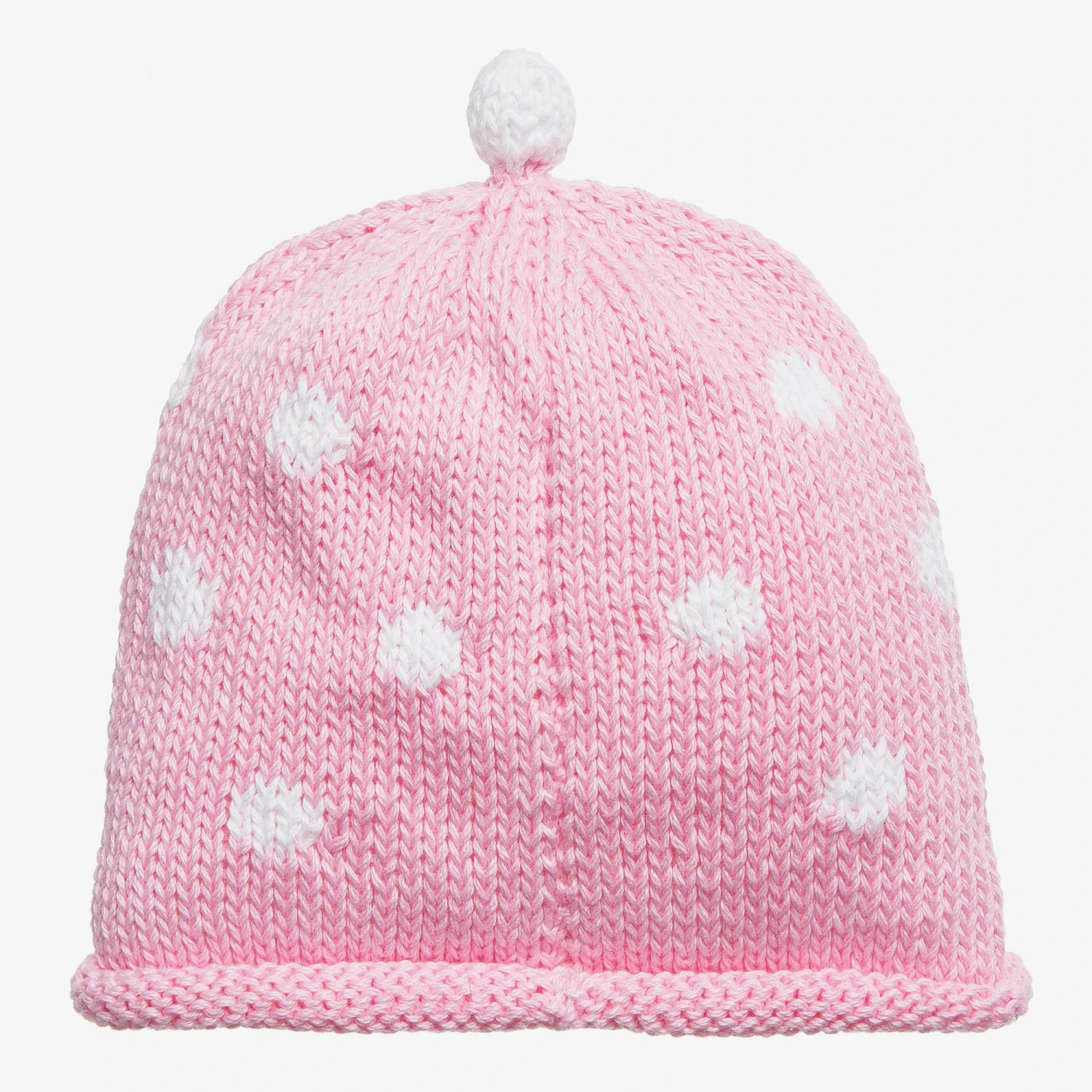 Merry Berries baby girls cute pink hat is made in the UK from stretchy knitted cotton. It has a rolled up trim and all over contrasting white spots.