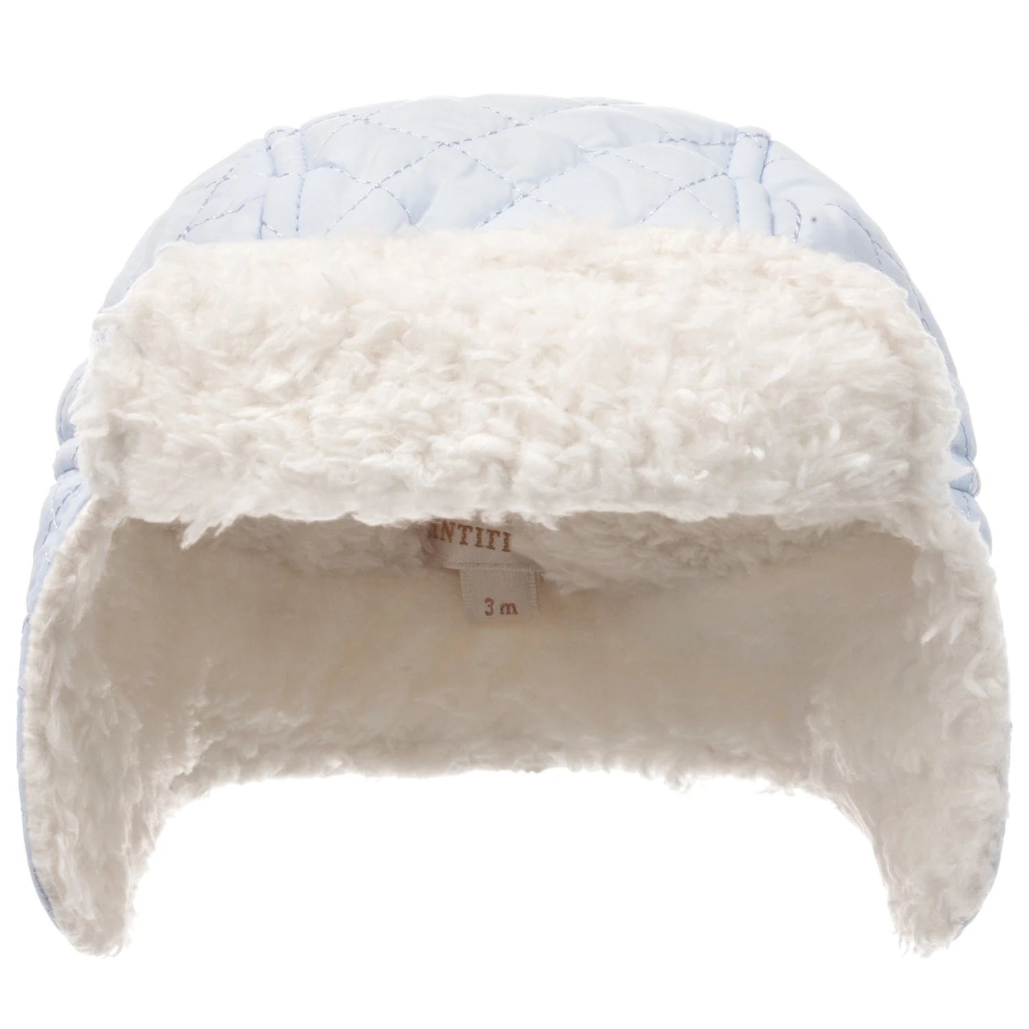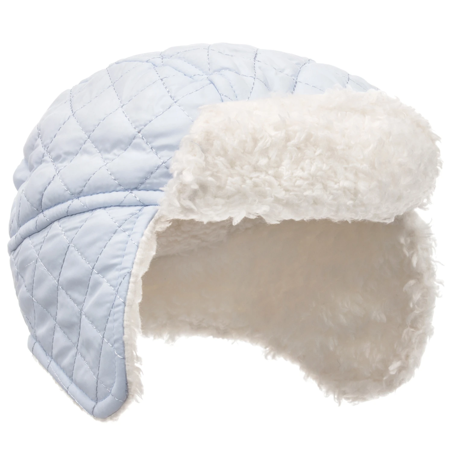 Pale blue quilted hat for little boys by Mintini Baby. It has a super soft fleece lining and ear flaps.