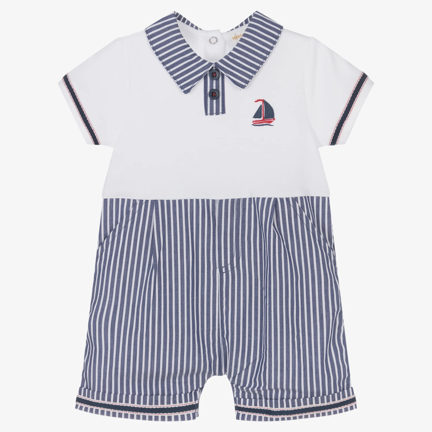 In white and navy blue, this nautical-themed cotton shortie for baby boys is by Mintini Baby. The upper part is made in soft jersey with a sweet embroidered sailboat motif. The striped lower part is in smooth poplin, with a pointed collar and faux button placket to match. Fastening with poppers on the back and between the legs, this cute shortie has pockets on the front and back.