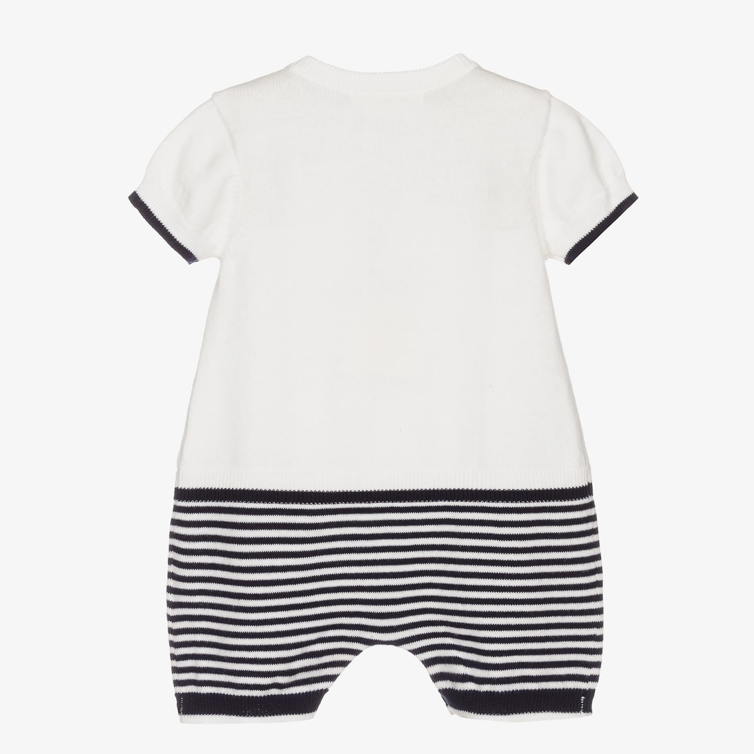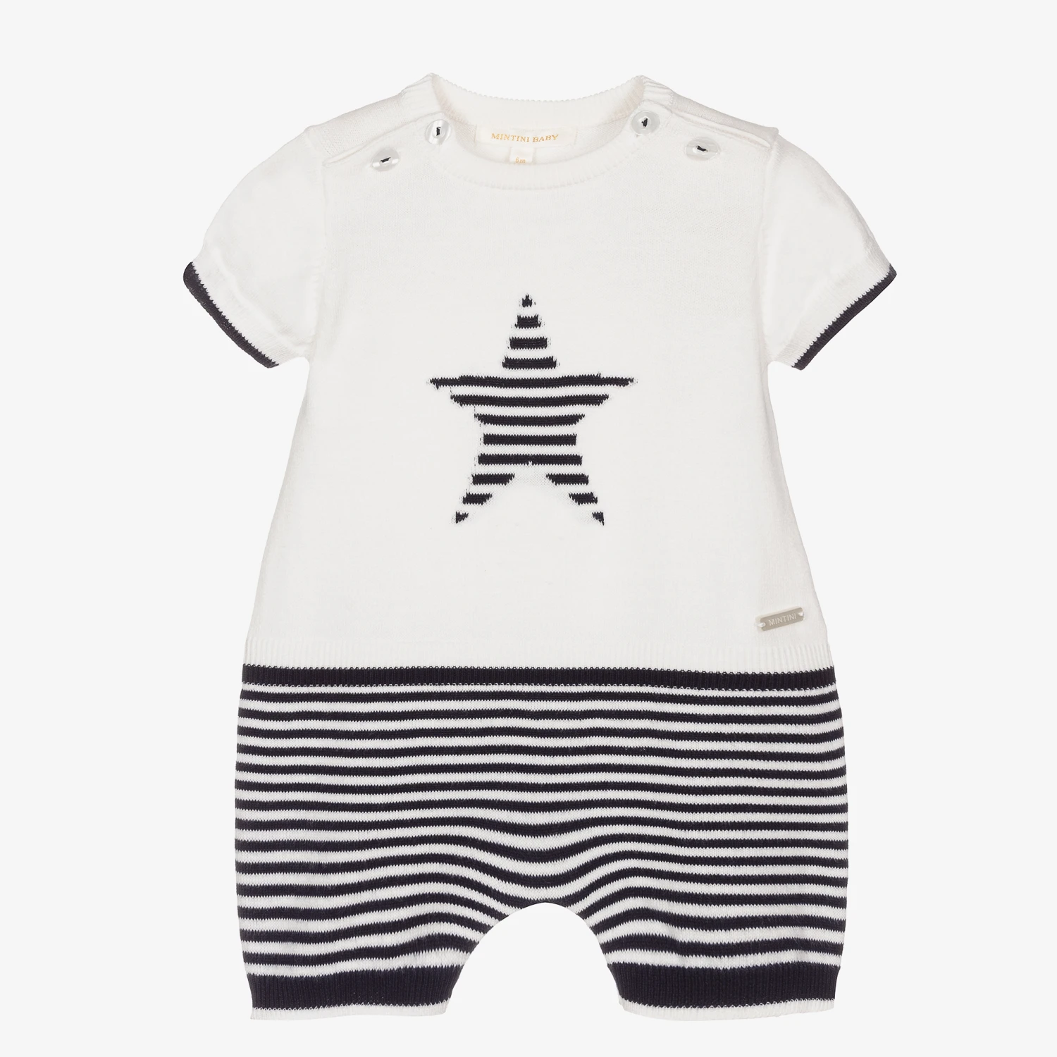 White and navy blue shortie for baby boys by Mintini Baby, knitted in soft cotton. It has a striped star on the front, to match the bottom part. There are button fastenings on the shoulders and underneath, and the brand’s logo plate is stitched on the waistline.