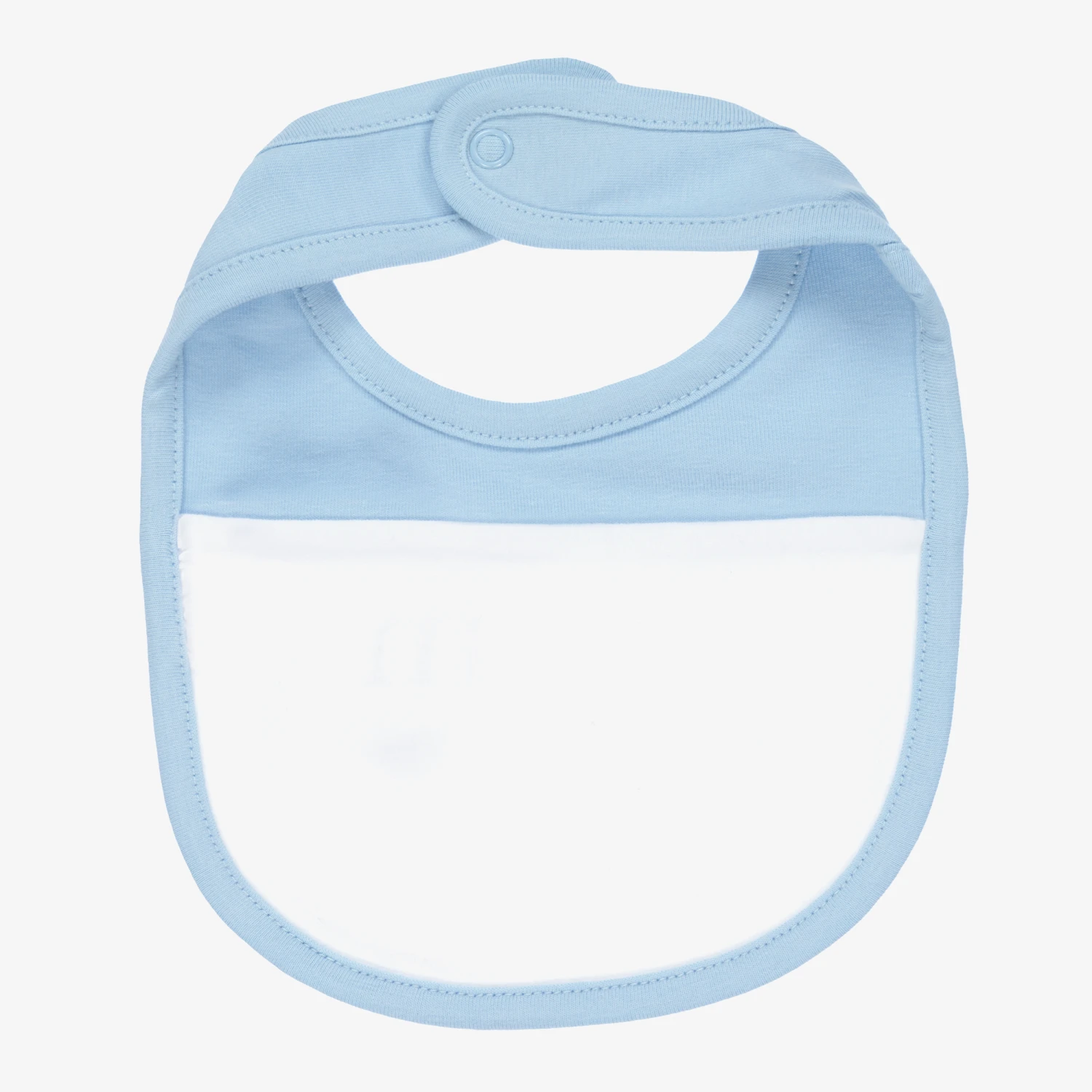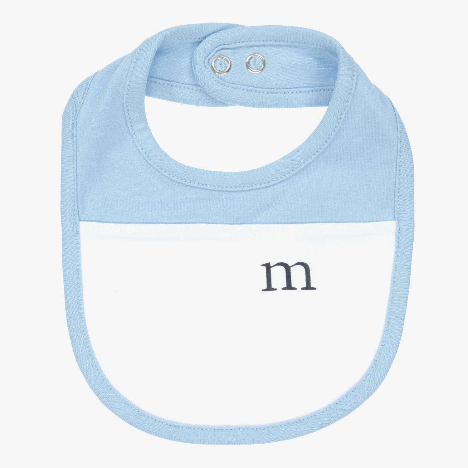 Pale blue and white bib for boys by Mitch & Son, made in soft cotton jersey. It has a small ‘m’ logo printed on the front, with a back popper fastening.