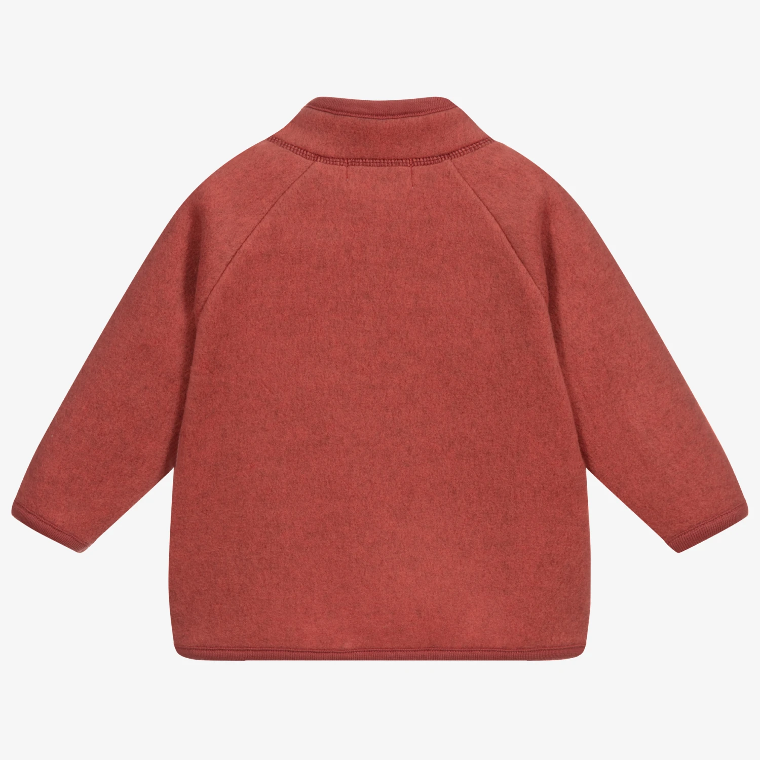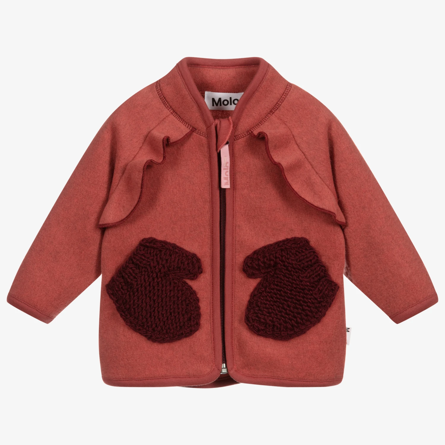 Rust red zip up top for baby girls by Molo, made in gorgeously soft polyester fleece. It has a bomber style collar, shoulder ruffles and deep red knitted pockets designed to look like mittens. It fastens conveniently with a zip on the front.