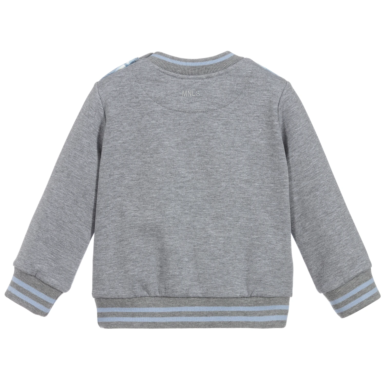 Grey sweatshirt for baby boys by Monnalisa, made in soft cotton sweatshirt jersey with a fleecy inside. It has a blue and white checked pattern on the front, with a white rabbit print from Disney’s ‘Alice in Wonderland’.
