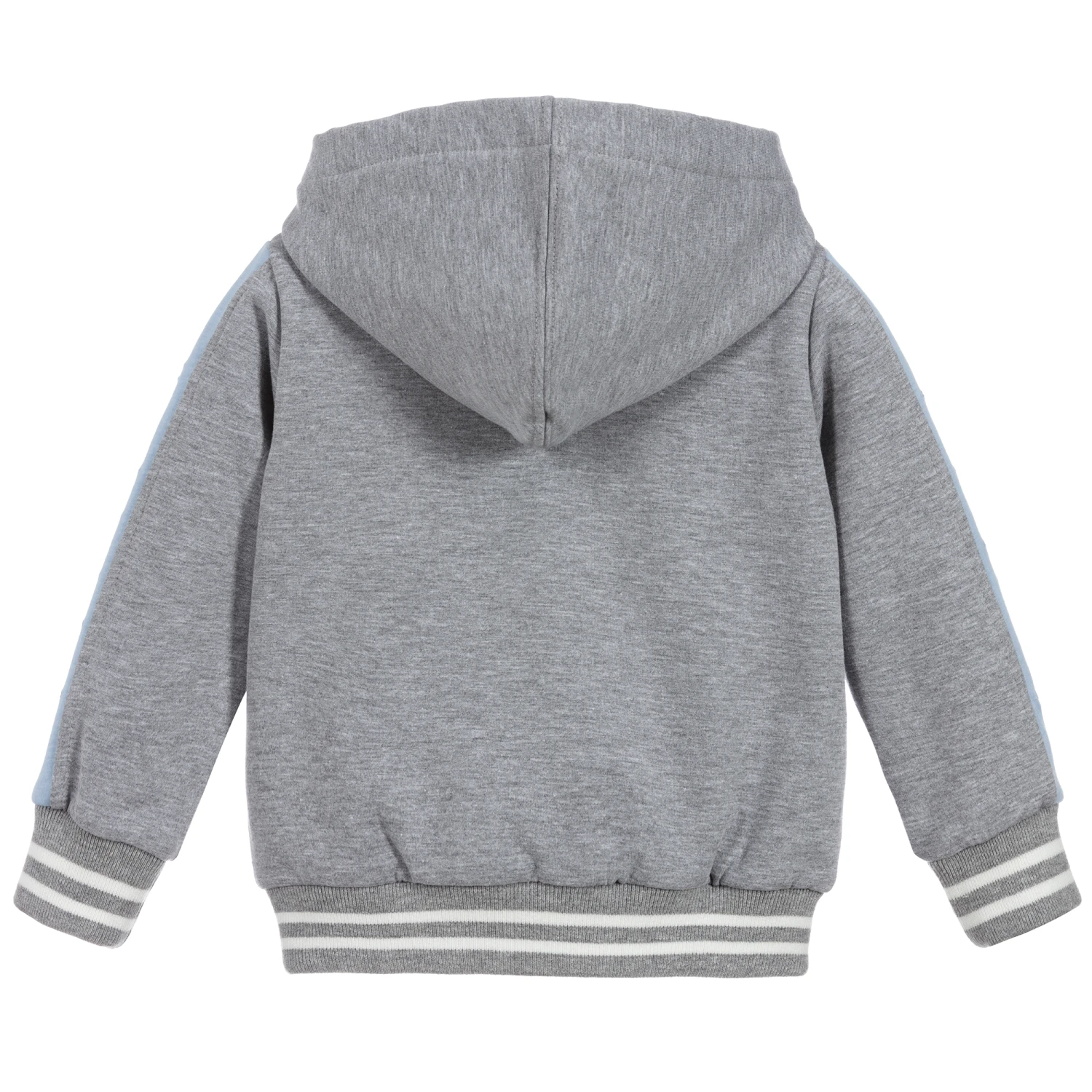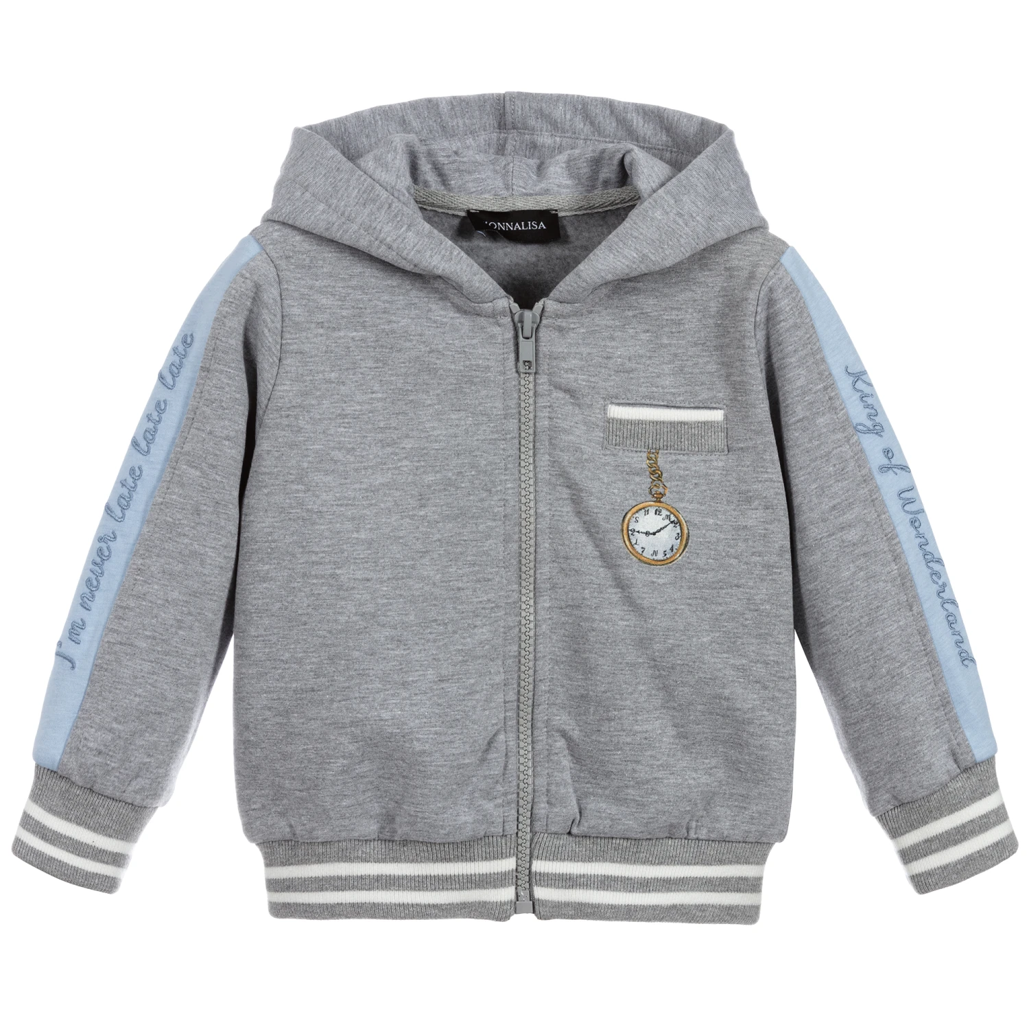 Baby boys grey hooded zip-up top by Monnalisa, made in soft cotton sweatshirt jersey, with a fleecy inside. It has a Disney ‘Alice in Wonderland’ theme, with a faux pocket and pocket watch print on the front. There are blue trims down each sleeve with the words ‘I’m never late late late’ and ‘King of Wonderland’.