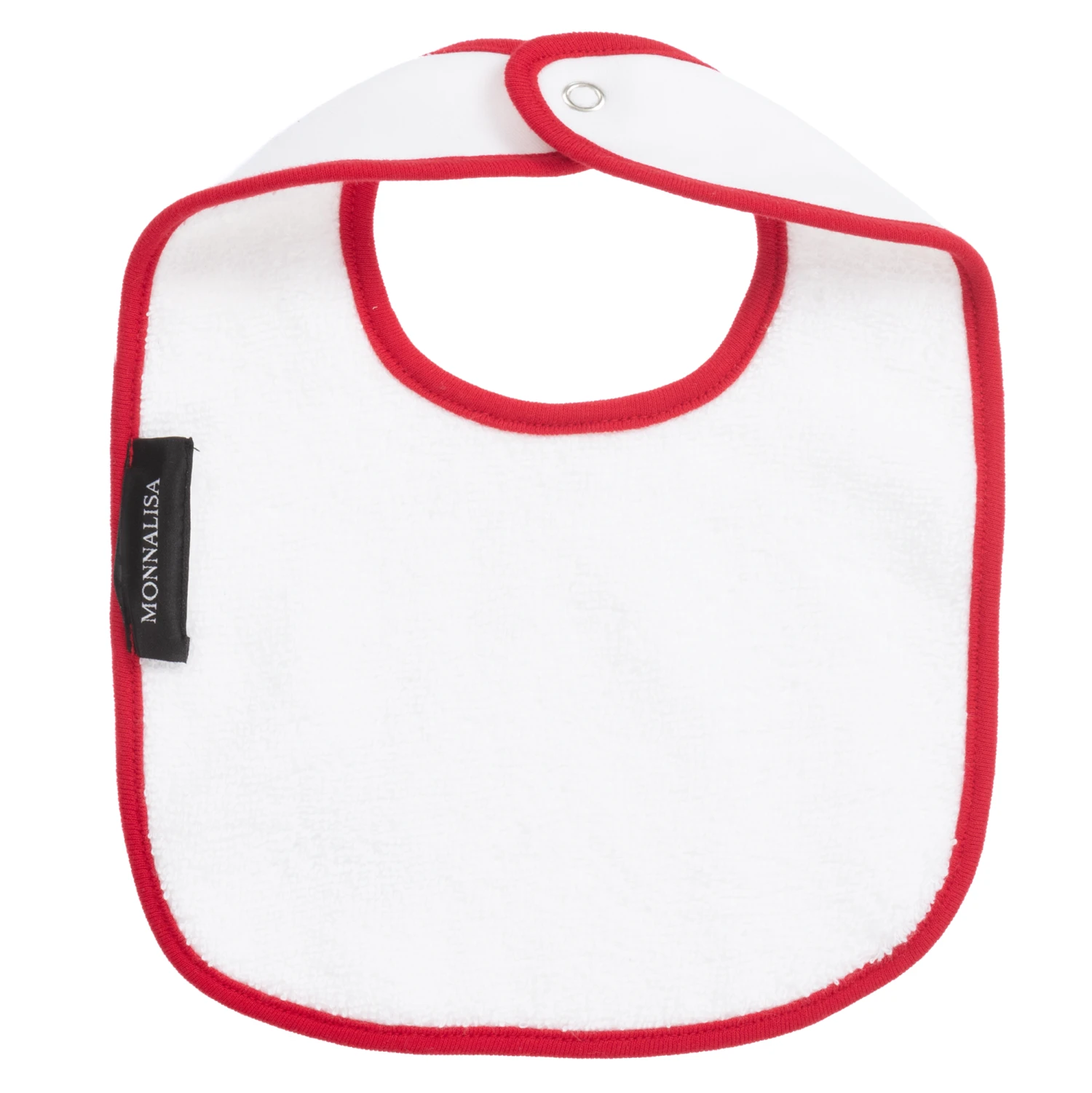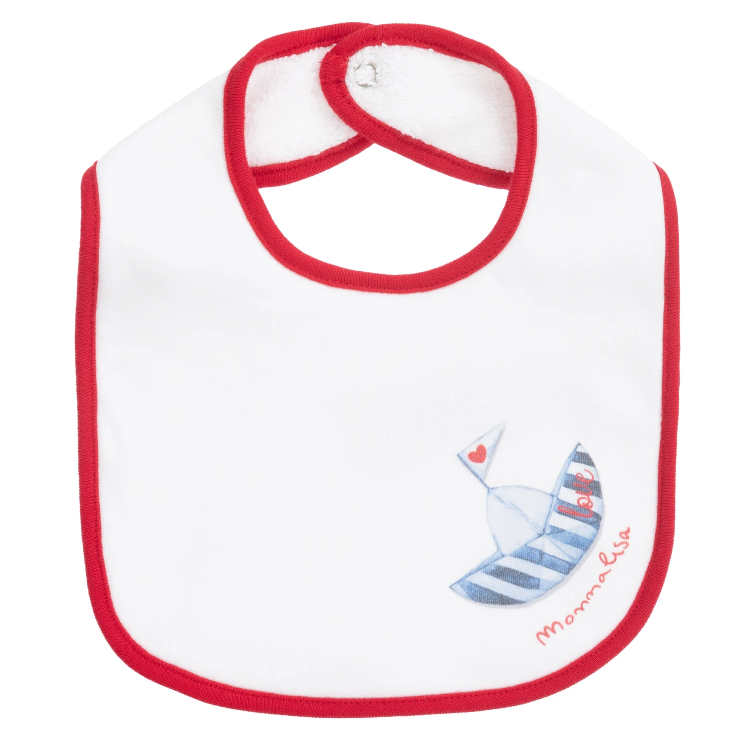 White bib for baby boys by Monnalisa, made in soft cotton jersey. Edged in red piping, it has a blue and red nautical print on the front. It fastens with a popper on the back and has a fluffy absorbent lining.