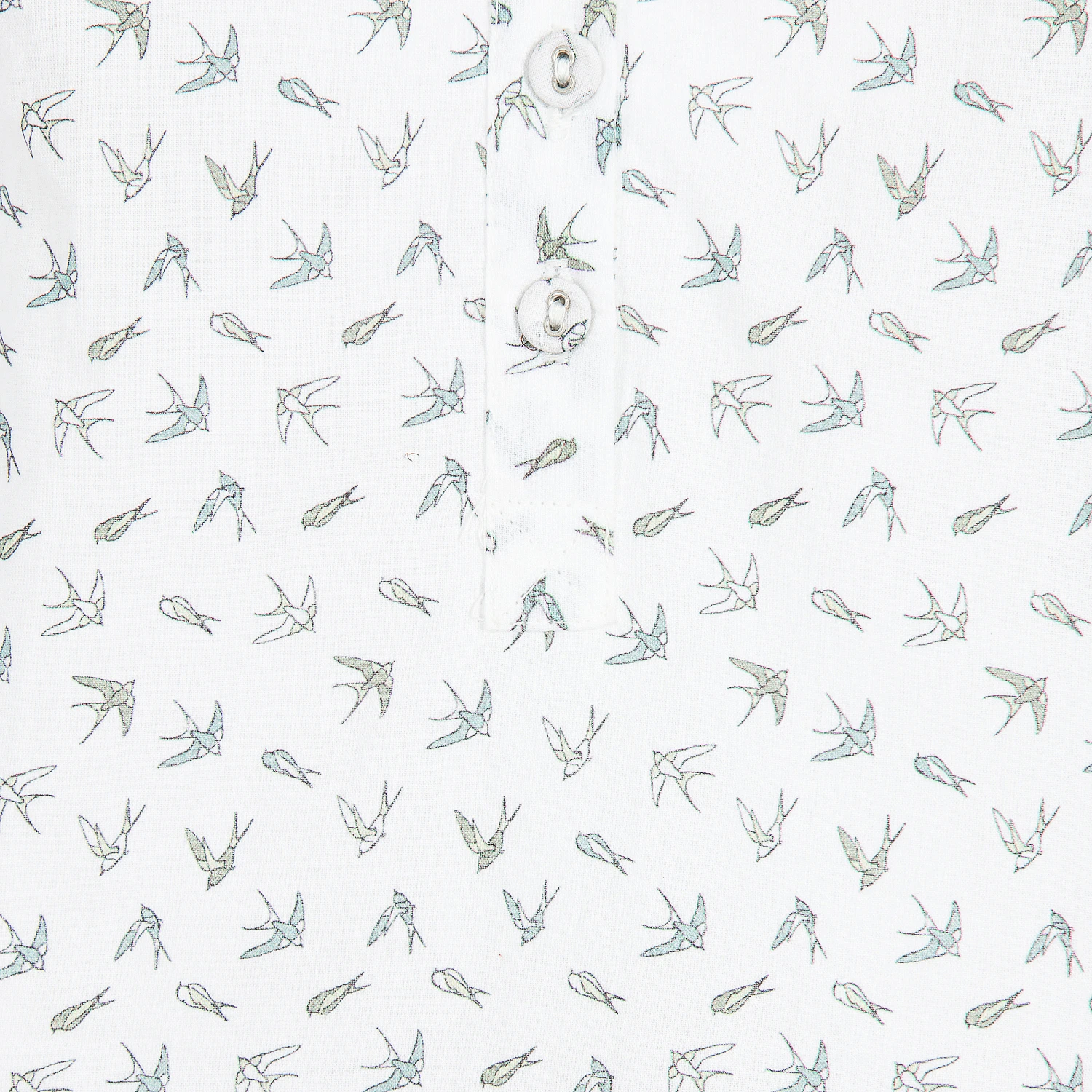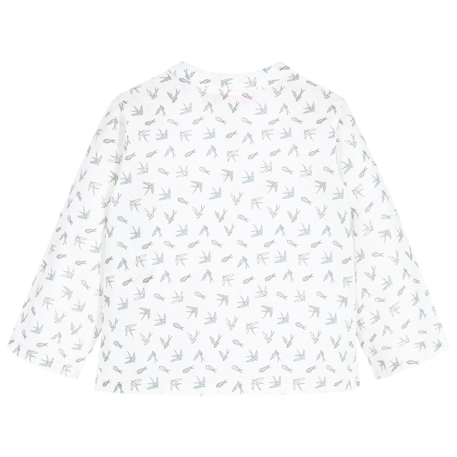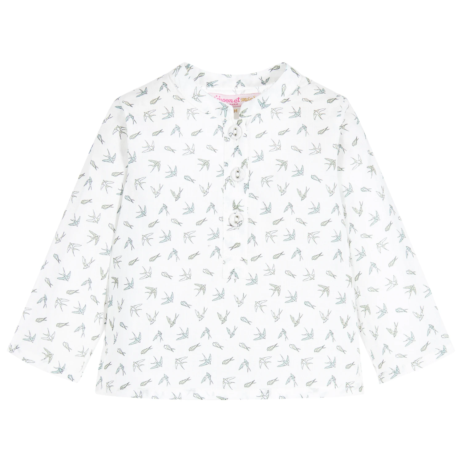 Baby girls white shirt with a cute pale green and blue bird print by Moon et Miel. It is made from smooth, lightweight cotton, with fabric covered buttons to fasten at the front. It has a mandarin collar and slits at the sides of the hem, allowing for movement.