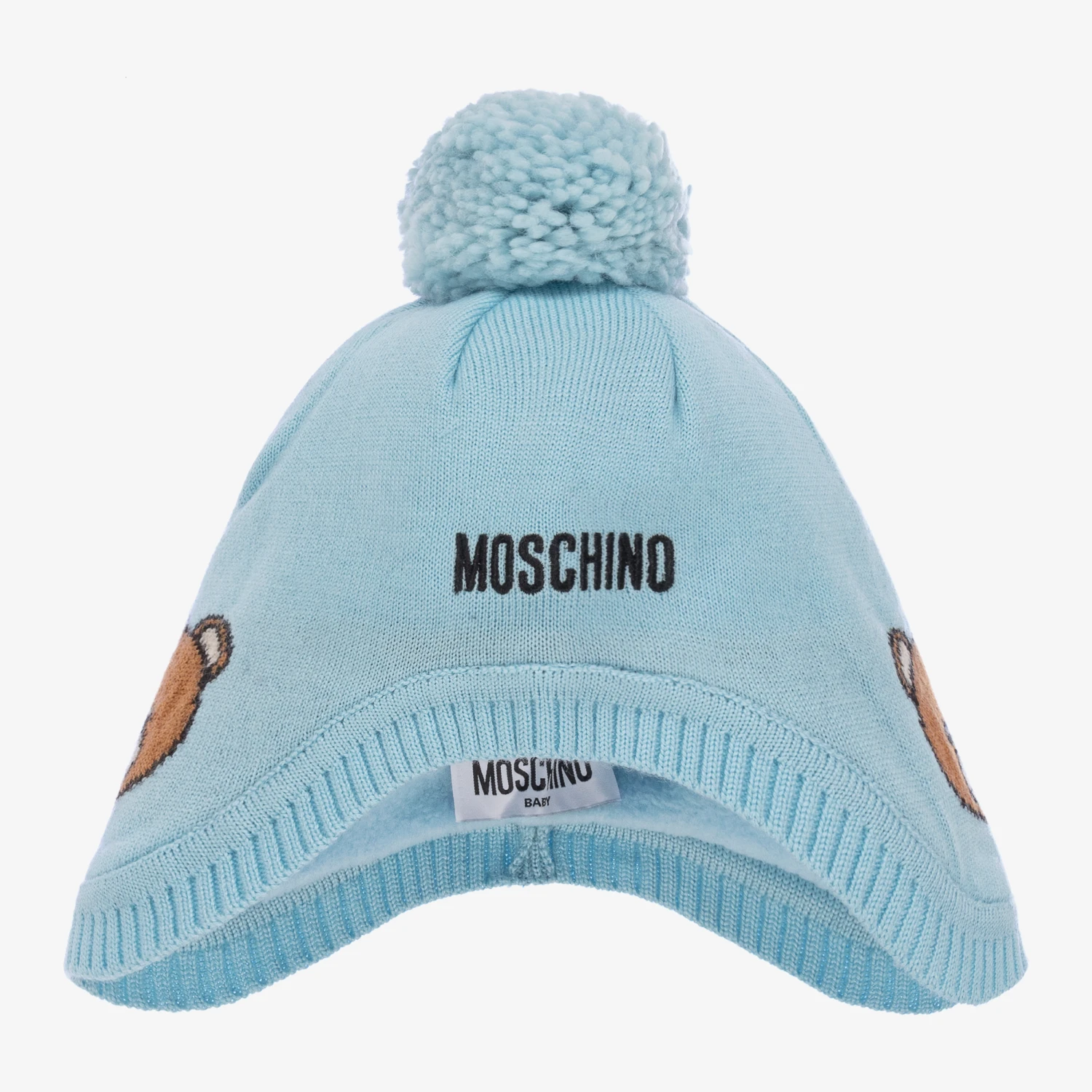 Pale blue pom-pom hat for baby boys and girls by Moschino Baby. It has an embroidered logo name on the front, with the brand’s signature Moschino Teddy Bear on either side. Cosy and comfy it is knitted in a soft wool blend, with a warm fleece lining.