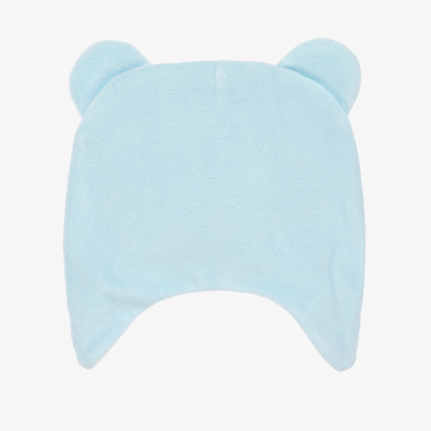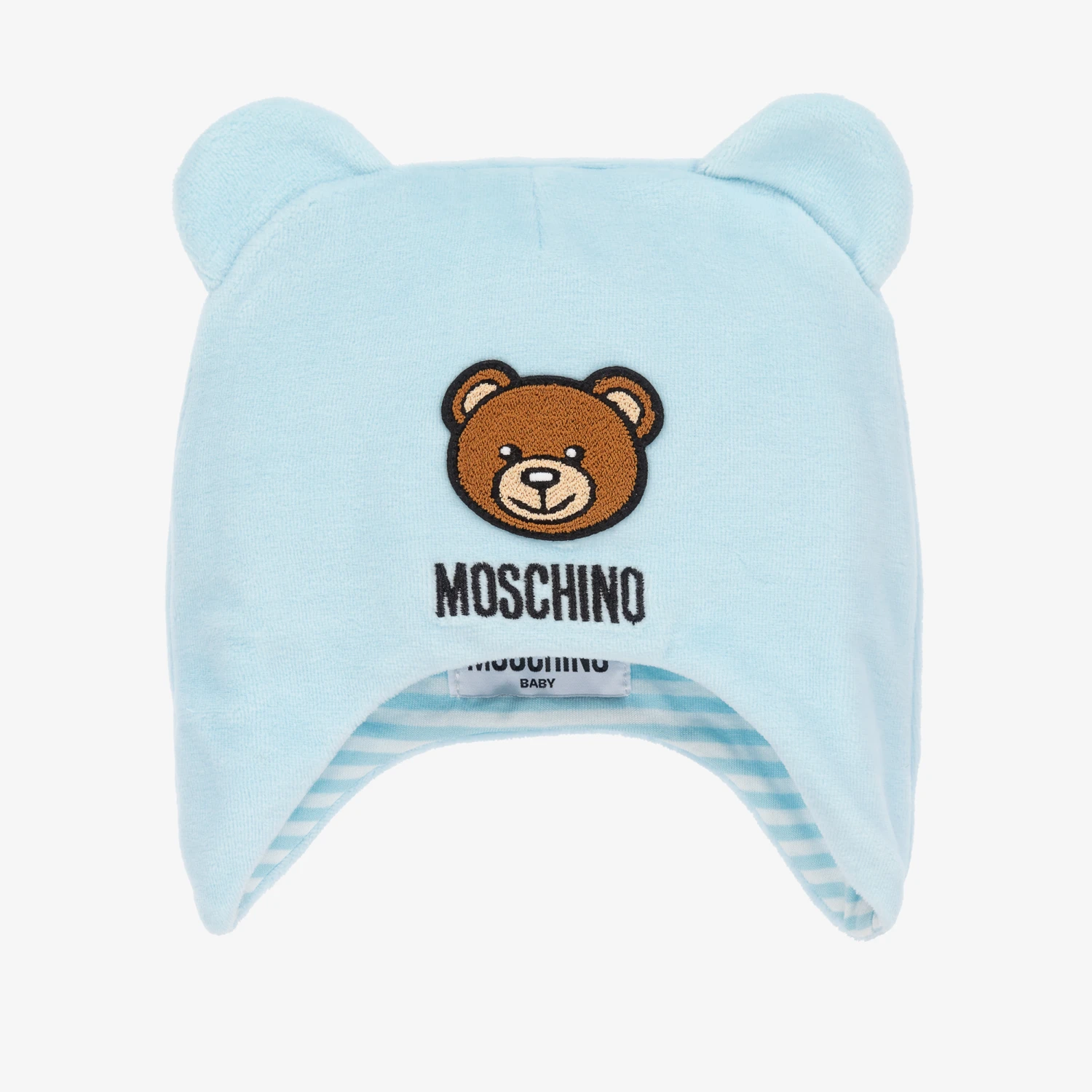 Blue hat for baby girls and boys by Moschino Baby, with a signature Moschino Teddy Bear appliqué on the front. It is made in soft velour and lined in blue striped cotton jersey. There are cute little ears on top, with useful flaps to keep little ears warm.