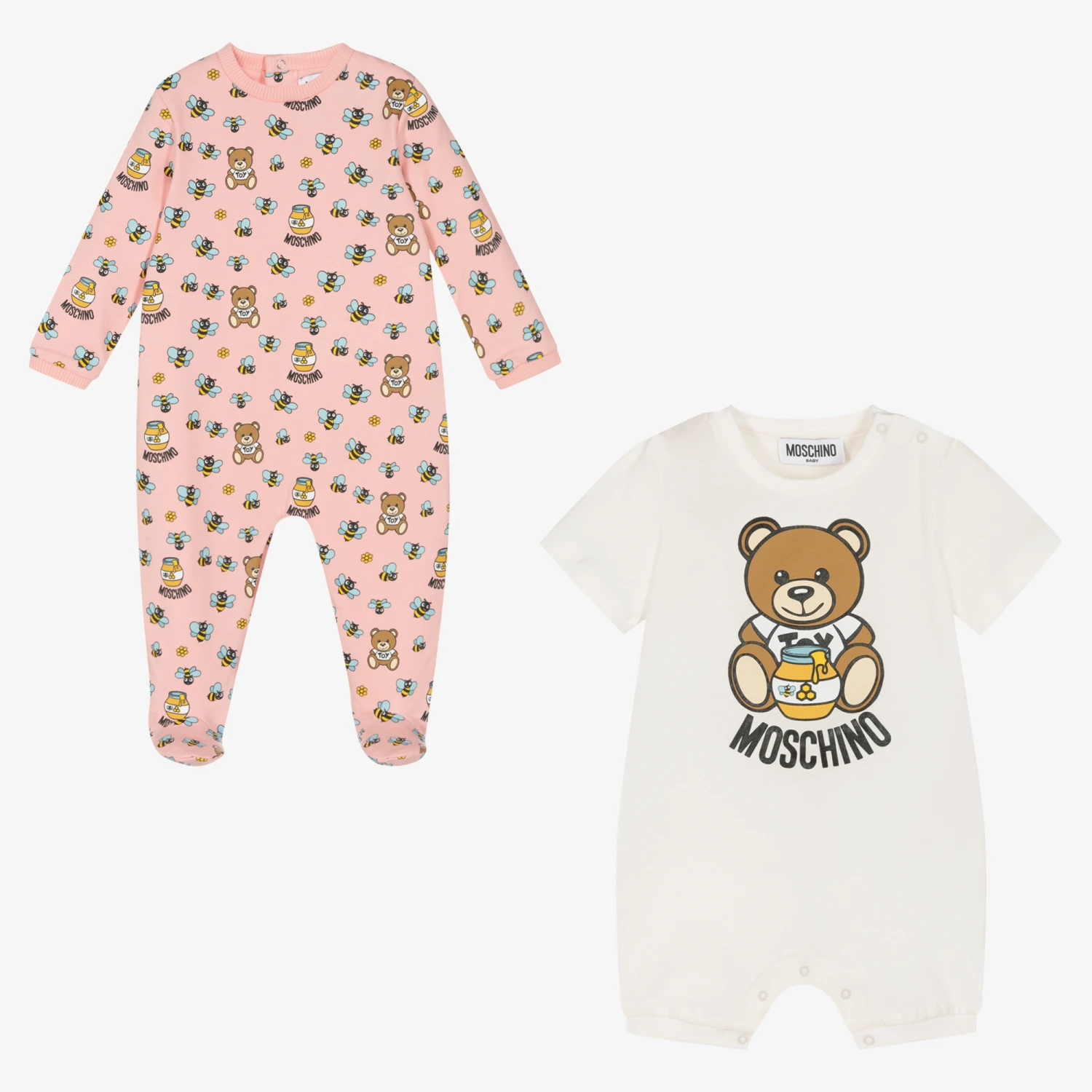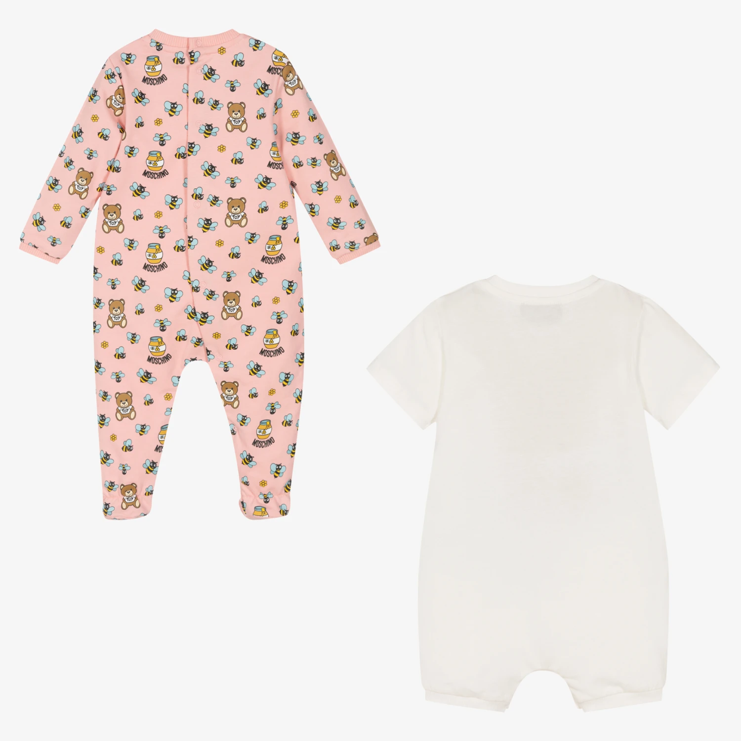 A two-pack of babysuits for girls, in pink and ivory, by Italian brand Moschino Baby. Made in luxuriously soft cotton jersey, both items have popper fastenings to make dressing easy. They feature the brand’s instantly eye-catching Teddy Bear logo, paired with charming bumblebees and honeypots. This set is presented in a box, making it lovely as a gift.