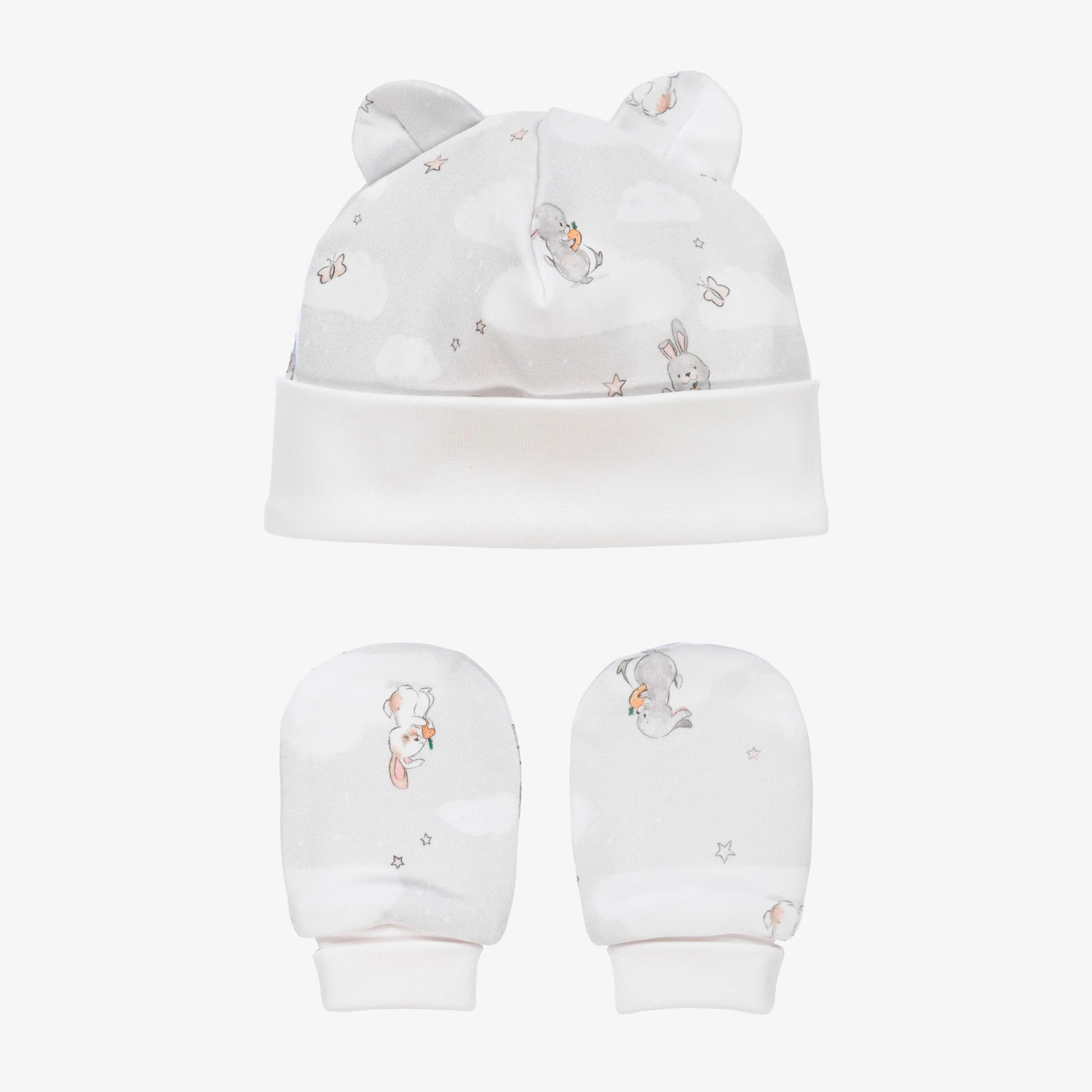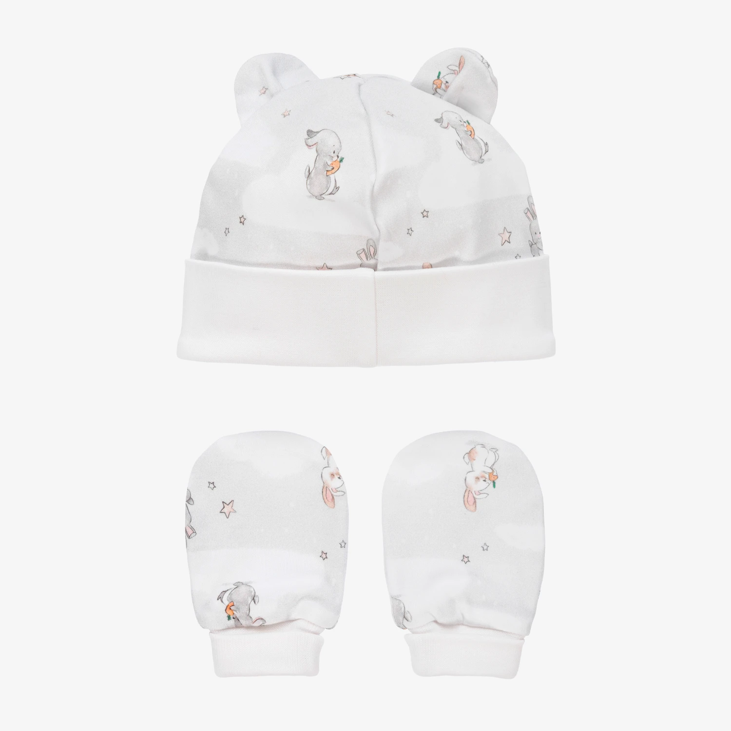 Baby boys and girls white hat and mittens set by My Little Pie. Made in super-soft Supima cotton, the fabric has a sweet bunny rabbit and cloud print in shades of beige and grey. The hat has cute 3D ears and the mittens have elasticated wrists so they stay on.